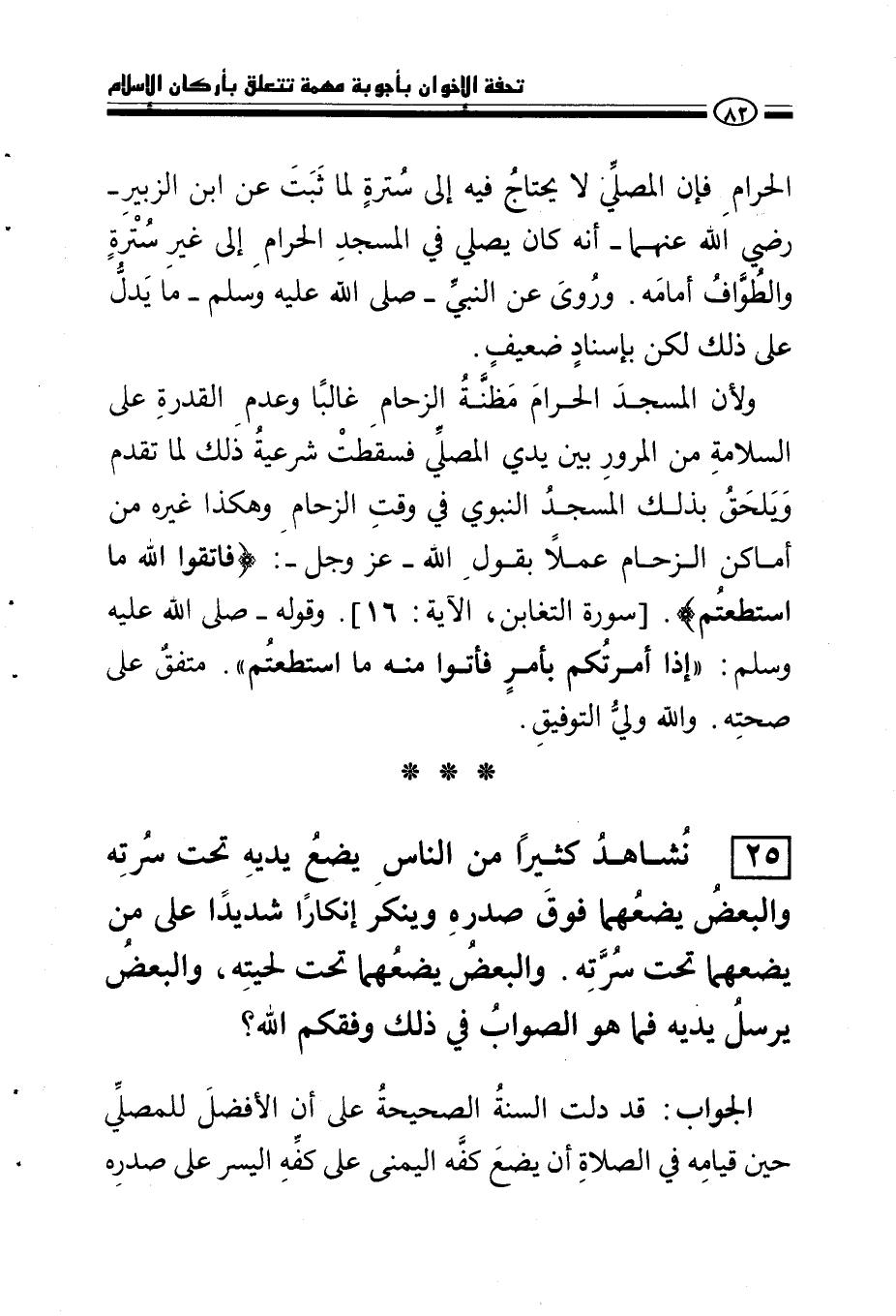 25 - نشاهد كثيرا من الناس يضع يديه تحت سرته والبعض يضعهما فوق صدره وينكر إنكارا شديدا على من يضعهما تحت سرته. والبعض يضعهما تحت لحيته، والبعض يرسل يديه فما هو الصواب في ذلك وفقكم الله؟