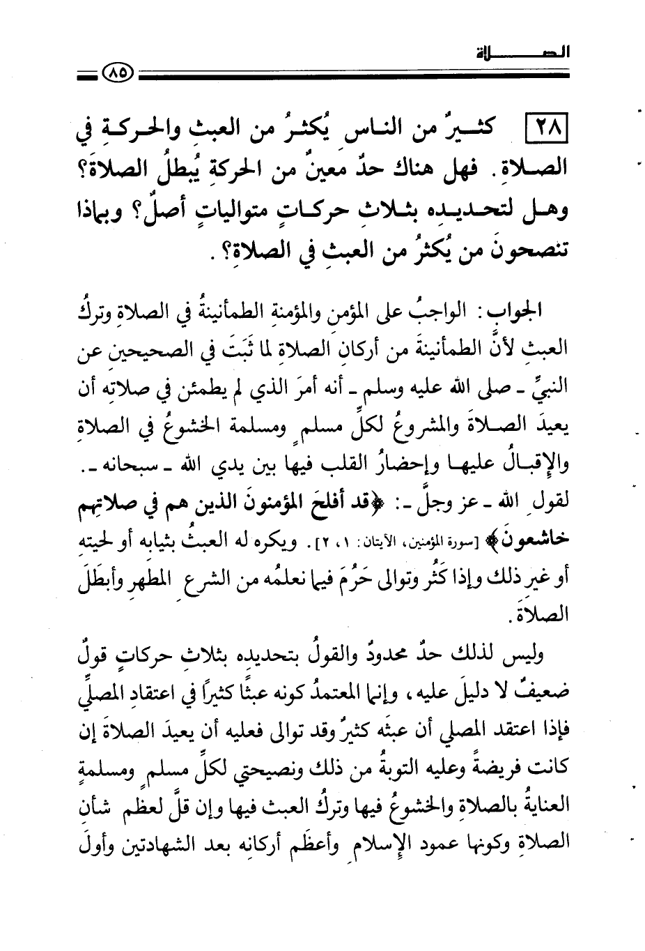 28 - كثير من الناس يكثر من العبث والحركة في الصلاة. فهل هناك حد معين من الحركة يبطل الصلاة؟ وهل لتحديده بثلاث حركات متواليات أصل؟ وبماذا تنصحون من يكثر من العبث في الصلاة؟