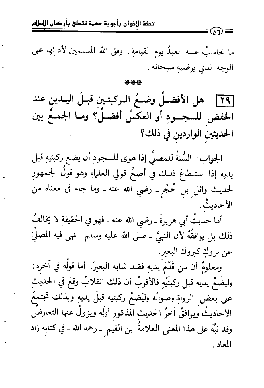 29 - هل الأفضل وضع الركبتين قبل اليدين عند الخفض للسجود أو العكس أفضل؟ وما الجمع بين الحديثين الواردين في ذلك؟