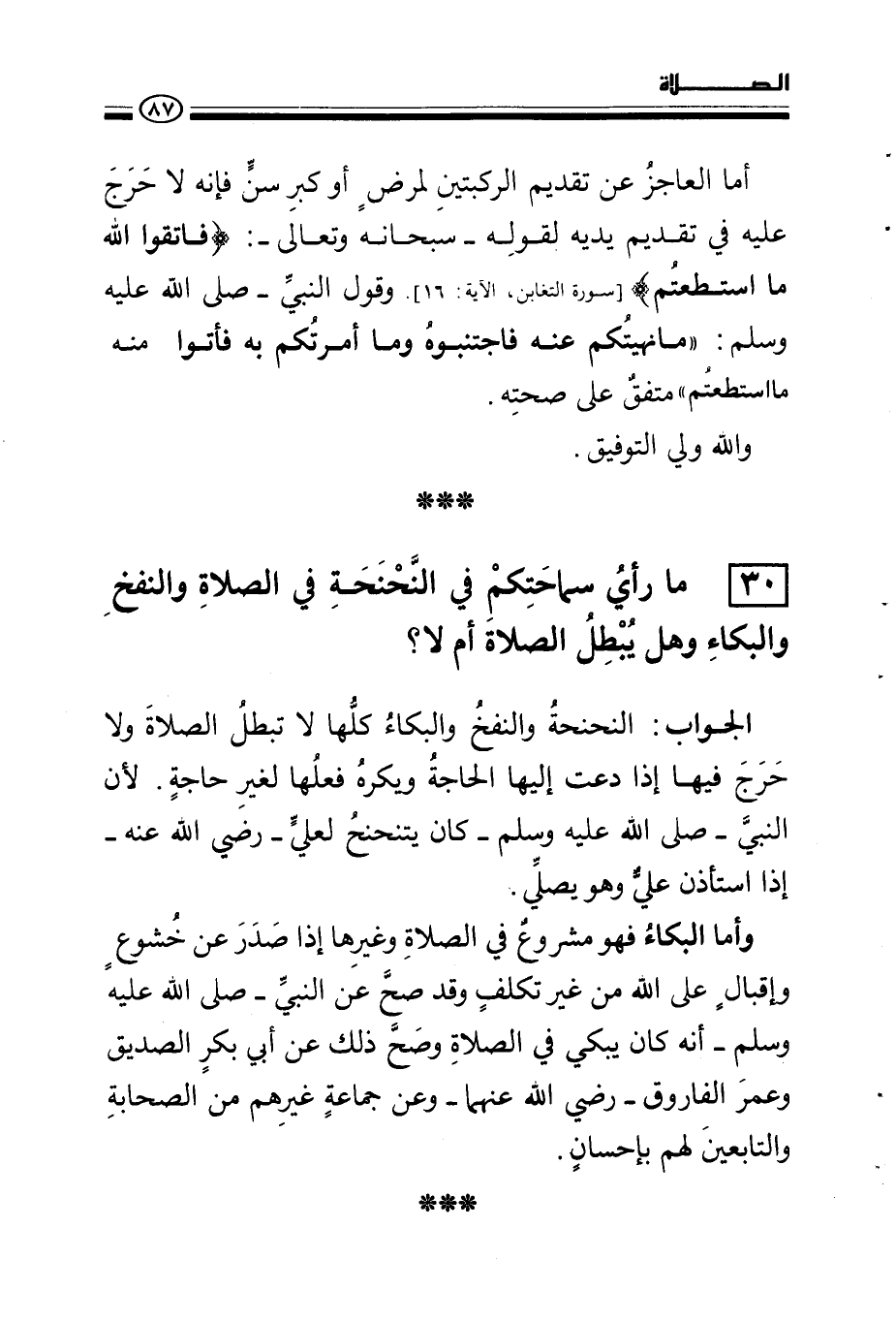 30 - ما رأي سماحتكم في النحنحة في الصلاة والنفخ والبكاء وهل يبطل الصلاة أو لا؟