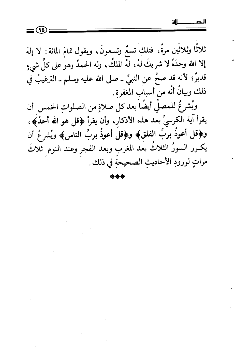 ويشرع للمصلي أيضا بعد كل صلاة من الصلوات الخمس أن يقرأ آية الكرسي بعد هذه الأذكار، وأن يقرأ قل هو الله أحد، وقل أعوذ برب الفلق، وقل أعوذ برب الناس ويشرع أن يكرر السور الثلاث بعد المغرب وبعد الفجر وعند النوم ثلاث مرات لورود الأحاديث الصحيحة في ذلك.