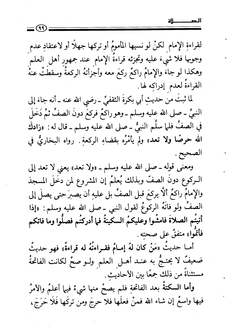 ومعنى قوله - صلى الله عليه وسلم - «ولا تعد» يعني لا تعد إلى الركوع دون الصف وبذلك يعلم أن المشروع لمن دخل المسجد والإمام راكع ألا يركع قبل الصف بل عليه أن يصبر حتى يصل إلى الصف ولو فاته الركوع لقول النبي - صلى الله عليه وسلم -: «إذا أتيتم الصلاة فامشوا وعليكم السكينة فما أدركتم فصلوا وما فاتكم فأتموا» متفق على صحته.