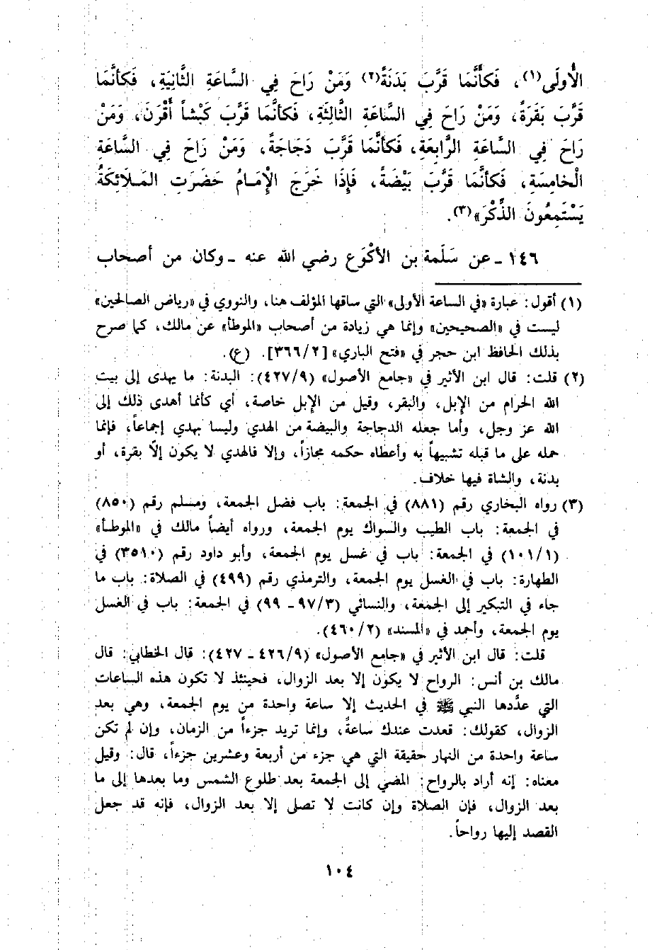 146 - عَنْ سَلَمَةَ بْنِ الأَكْوَعِ - وَكَانَ مِنْ أَصْحَابِ -[105]- الشَّجَرَةِ - رضي الله عنه - قَالَ: ((كُنَّا نُصَلِّي مَعَ رَسُولِ اللَّهِ - صلى الله عليه وسلم - الْجُمُعَةَ , ثُمَّ نَنْصَرِفُ. وَلَيْسَ لِلْحِيطَانِ ظِلٌّ نَسْتَظِلُّ بِهِ)) .