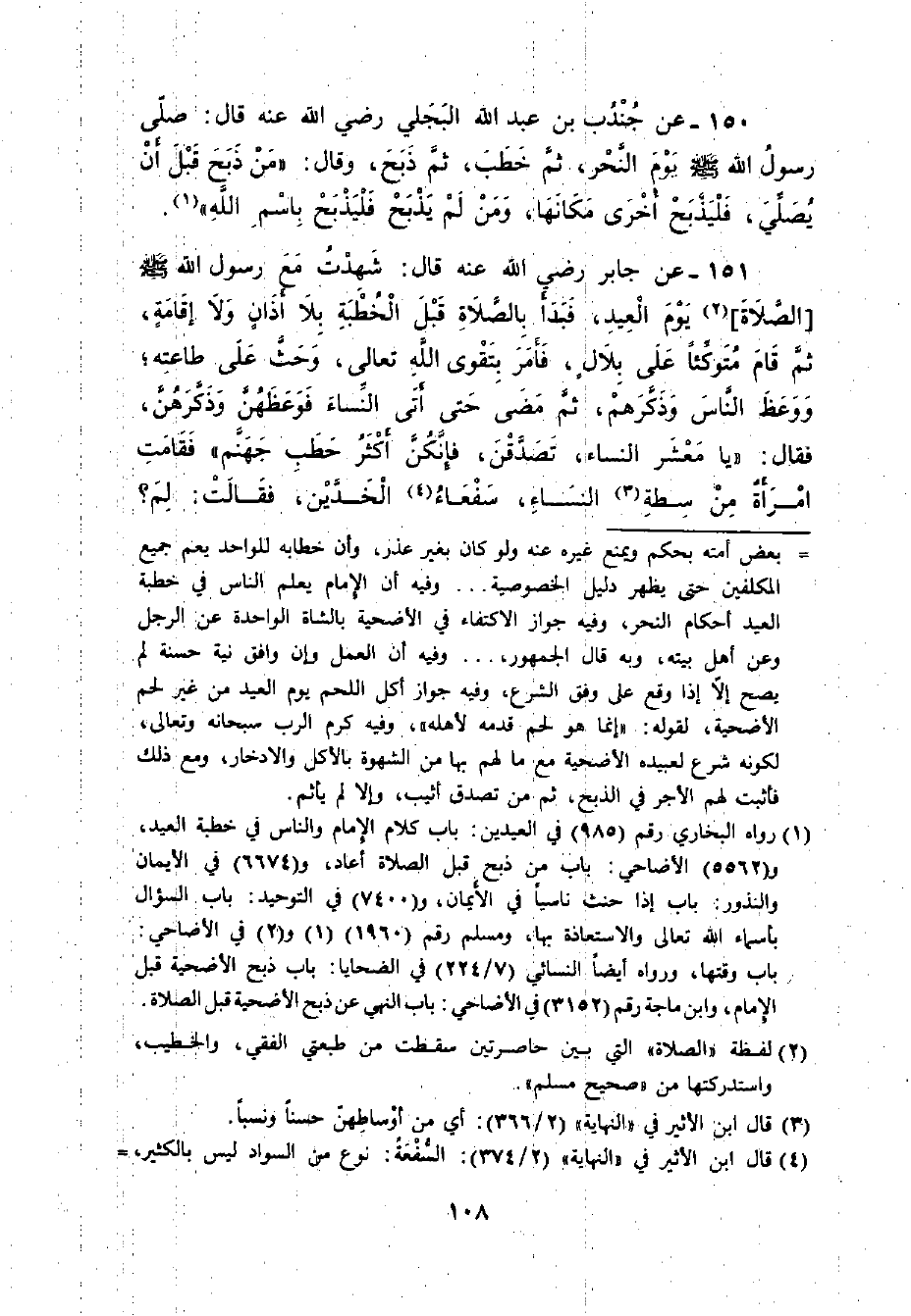 151 - عَنْ جَابِرٍ - رضي الله عنه - قَالَ: ((شَهِدْتُ مَعَ النَّبِيِّ - صلى الله عليه وسلم - يَوْمَ الْعِيدِ. فَبَدَأَ بِالصَّلاةِ قَبْلَ الْخُطْبَةِ , بِلا أَذَانٍ وَلا إقَامَةٍ. ثُمَّ قَامَ مُتَوَكِّئًا عَلَى بِلالٍ , فَأَمَرَ بِتَقْوَى اللَّهِ تَعَالَى , وَحَثَّ عَلَى طَاعَتِهِ , وَوَعَظَ النَّاسَ وَذَكَّرَهُمْ , ثُمَّ مَضَى حَتَّى أَتَى النِّسَاءَ فَوَعَظَهُنَّ وَذَكَّرَهُنَّ , وَقَالَ: يَا مَعْشَرَ النِّسَاءِ , تَصَدَّقْنَ. فَإِنَّكُنَّ أَكْثَرُ حَطَبِ جَهَنَّمَ , فَقَامَتْ امْرَأَةٌ مِنْ سِطَةِ النِّسَاءِ , سَفْعَاءُ الْخَدَّيْنِ فَقَالَتْ: لِمَ -[109]- يَا رَسُولَ اللَّهِ فَقَالَ: لأَنَّكُنَّ تُكْثِرْنَ الشَّكَاةَ , وَتَكْفُرْنَ الْعَشِيرَ. قَالَ: فَجَعَلْنَ يَتَصَدَّقْنَ مِنْ حُلِيِّهِنَّ يُلْقِينَ فِي ثَوْبِ بِلالٍ مِنْ أَقْرَاطِهِنَّ وَخَوَاتِيمِهِنَّ)) .