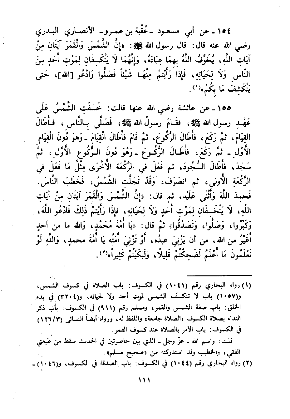 155 - عَنْ عَائِشَةَ رضي الله عنها أَنَّهَا قَالَتْ: ((خَسَفَتِ الشَّمْسُ عَلَى عَهْدِ رَسُولِ اللَّهِ - صلى الله عليه وسلم - فَصَلَّى رَسُولُ اللَّهِ - صلى الله عليه وسلم - بِالنَّاسِ. فَأَطَالَ الْقِيَامَ , ثُمَّ رَكَعَ , فَأَطَالَ الرُّكُوعَ , ثُمَّ قَامَ , فَأَطَالَ الْقِيَامَ - وَهُوَ دُونَ الْقِيَامِ الأَوَّلِ - ثُمَّ رَكَعَ , فَأَطَالَ الرُّكُوعَ - وَهُوَ دُونَ الرُّكُوعِ الأَوَّلِ - ثُمَّ سَجَدَ , فَأَطَالَ السُّجُودَ , ثُمَّ فَعَلَ فِي الرَّكْعَةِ الأُخْرَى مِثْلَ مَا فَعَلَ فِي الرَّكْعَةِ الأُولَى , ثُمَّ انْصَرَفَ , وَقَدْ تَجَلَّتْ الشَّمْسُ , فَخَطَبَ النَّاسَ , فَحَمِدَ اللَّهَ وَأَثْنَى عَلَيْهِ , ثُمَّ قَالَ: إنَّ الشَّمْسَ وَالْقَمَرَ آيَتَانِ مِنْ آيَاتِ اللَّهِ , لا يَخْسِفَانِ لِمَوْتِ أَحَدٍ وَلا لِحَيَاتِهِ , فَإِذَا رَأَيْتُمْ ذَلِكَ فَادْعُوا اللَّهَ وَكَبِّرُوا , وَصَلُّوا وَتَصَدَّقُوا , ثُمَّ قَالَ: يَا أُمَّةَ مُحَمَّدٍ , وَاَللَّهِ مَا مِنْ أَحَدٍ أَغْيَرُ مِنْ اللَّهِ أَنْ يَزْنِيَ عَبْدُهُ , أَوْ تَزْنِيَ أَمَتُهُ , يَا أُمَّةَ مُحَمَّدٍ , وَاَللَّهِ لَوْ تَعْلَمُونَ مَا أَعْلَمُ لَضَحِكْتُمْ قَلِيلاً وَلَبَكَيْتُمْ كَثِيراً)) . -[112]-