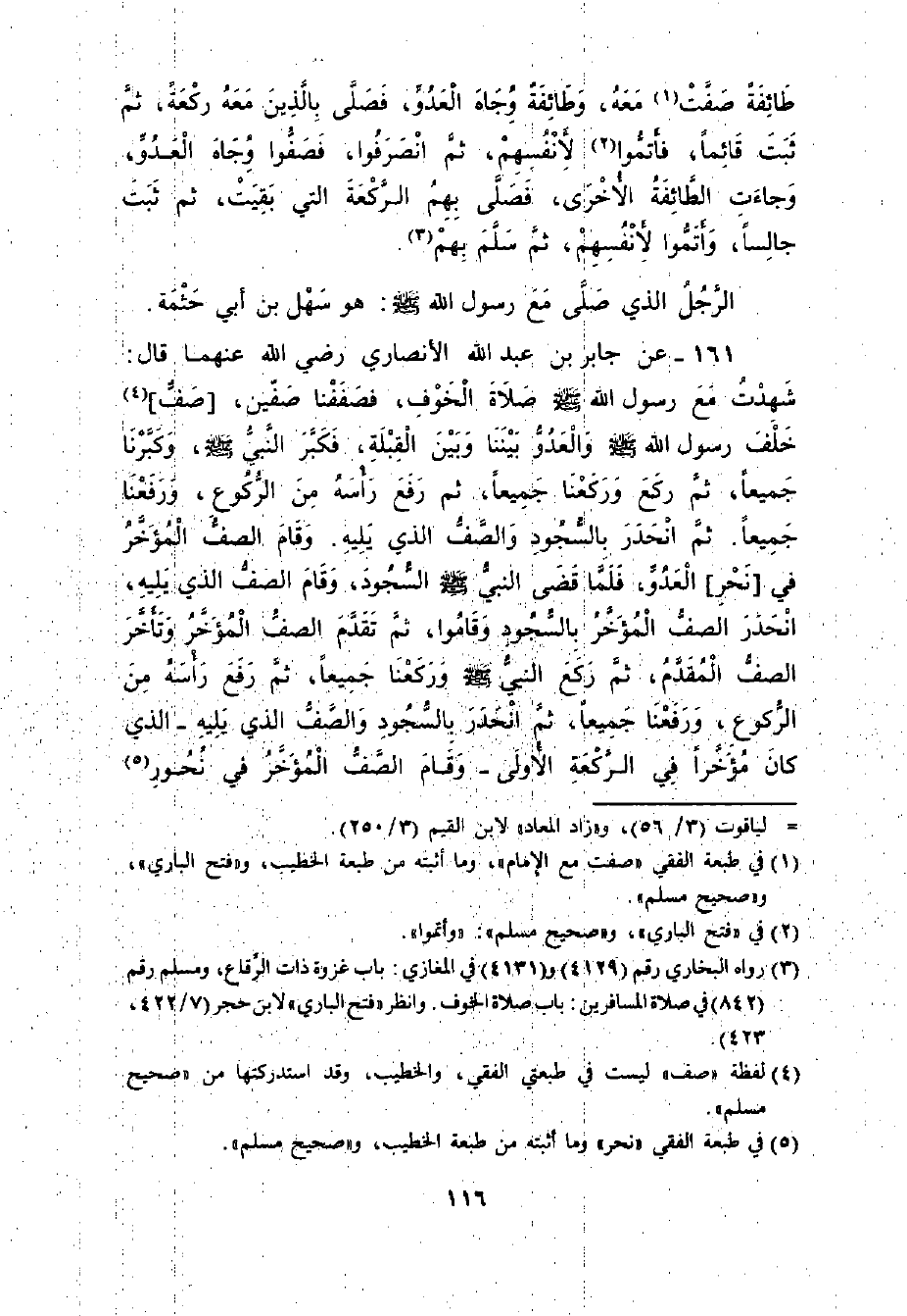 161 - عَنْ جَابِرِ بْنِ عَبْدِ اللَّهِ الأَنْصَارِيِّ رضي الله عنهما قَالَ: ((شَهِدْتُ مَعَ رَسُولِ اللَّهِ - صلى الله عليه وسلم - صَلاةَ الْخَوْفِ فَصَفَفْنَا صَفَّيْنِ خَلْفَ رَسُولِ اللَّهِ - صلى الله عليه وسلم - وَالْعَدُوُّ بَيْنَنَا وَبَيْنَ الْقِبْلَةِ , وَكَبَّرَ النَّبِيُّ - صلى الله عليه وسلم - وَكَبَّرْنَا جَمِيعاً , ثُمَّ رَكَعَ وَرَكَعْنَا جَمِيعاً , ثُمَّ رَفَعَ رَأْسَهُ مِنْ الرُّكُوعِ وَرَفَعْنَا جَمِيعاً , ثُمَّ انْحَدَرَ بِالسُّجُودِ وَالصَّفُّ الَّذِي يَلِيهِ , وَقَامَ الصَّفُّ الْمُؤَخَّرُ فِي نَحْرِ الْعَدُوِّ , فَلَمَّا قَضَى النَّبِيُّ - صلى الله عليه وسلم - السُّجُودَ , وَقَامَ الصَّفُّ الَّذِي يَلِيهِ: انْحَدَرَ الصَّفُّ الْمُؤَخَّرُ بِالسُّجُودِ , وَقَامُوا , ثُمَّ تَقَدَّمَ الصَّفُّ الْمُؤَخَّرُ , وَتَأَخَّرَ الصَّفُّ الْمُقَدَّمُ , ثُمَّ رَكَعَ النَّبِيُّ - صلى الله عليه وسلم - وَرَكَعْنَا جَمِيعاً , ثُمَّ رَفَعَ رَأْسَهُ مِنْ الرُّكُوعِ وَرَفَعْنَا جَمِيعاً , ثُمَّ انْحَدَرَ بِالسُّجُودِ , وَالصَّفُّ الَّذِي يَلِيهِ - الَّذِي كَانَ مُؤَخَّرًا فِي الرَّكْعَةِ الأُولَى - فَقَامَ الصَّفُّ الْمُؤَخَّرُ فِي نَحْرِ -[117]- الْعَدُوِّ , فَلَمَّا قَضَى النَّبِيُّ - صلى الله عليه وسلم - السُّجُودَ وَالصَّفُّ الَّذِي يَلِيهِ: انْحَدَرَ الصَّفُّ الْمُؤَخَّرُ بِالسُّجُودِ , فَسَجَدُوا ثُمَّ سَلَّمَ - صلى الله عليه وسلم - وَسَلَّمْنَا جَمِيعاً , قَالَ جَابِرٌ: كَمَا يَصْنَعُ حَرَسُكُمْ هَؤُلاءِ بِأُمَرَائِهِمْ)) .