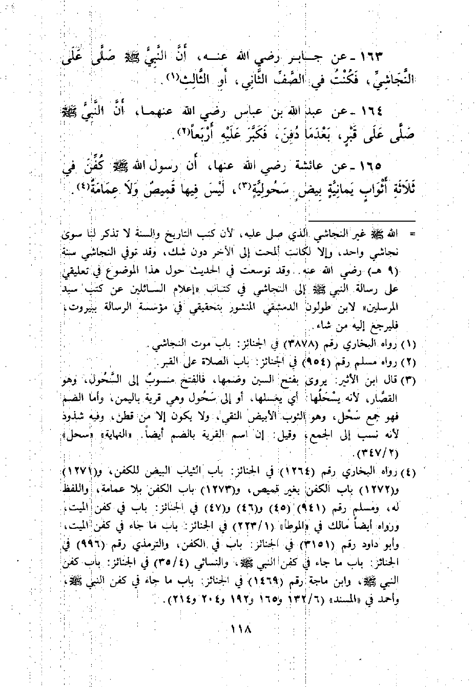 165 - عَنْ عَائِشَةَ رضي الله عنها: ((أَنَّ رَسُولَ اللَّهِ - صلى الله عليه وسلم - كُفِّنَ فِي أَثْوَابٍ بِيضٍ يَمَانِيَةٍ , لَيْسَ فِيهَا قَمِيصٌ وَلا عِمَامَةٌ)) . -[119]-