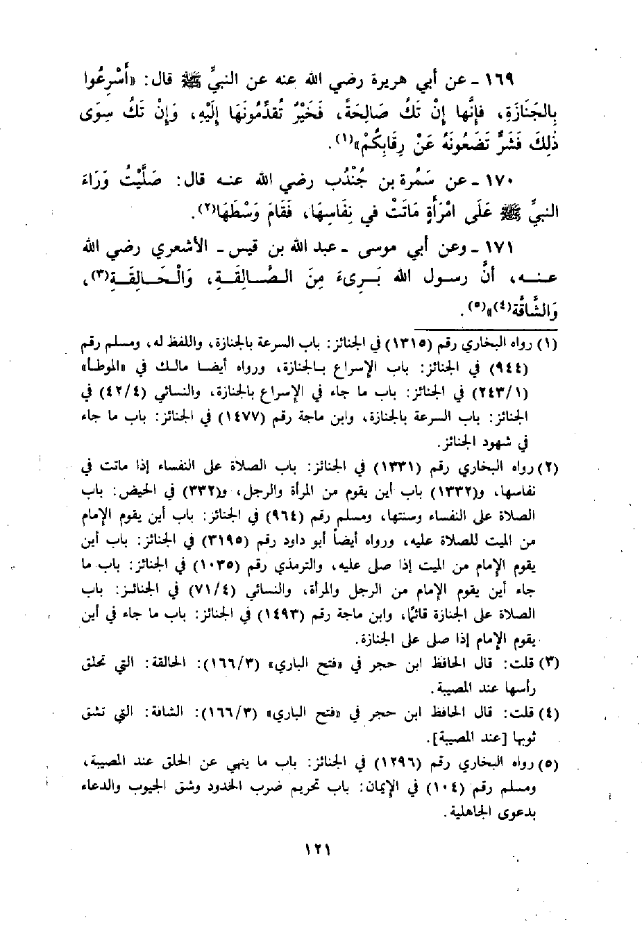 169 - عَنْ أَبِي هُرَيْرَةَ - رضي الله عنه - عَنْ النَّبِيِّ - صلى الله عليه وسلم - قَالَ: ((أَسْرِعُوا بِالْجِنَازَةِ فَإِنَّهَا إنْ تَكُ صَالِحَةً: فَخَيْرٌ تُقَدِّمُونَهَا إلَيْهِ. وَإِنْ تَكُ سِوَى ذَلِكَ: فَشَرٌّ: تَضَعُونَهُ عَنْ رِقَابِكُمْ)) .