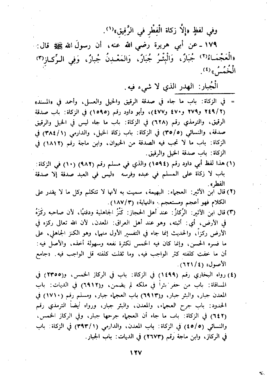 179 - عَنْ أَبِي هُرَيْرَةَ - رضي الله عنه -: أَنَّ رَسُولَ اللَّهِ - صلى الله عليه وسلم - قَالَ: ((الْعَجْمَاءُ جُبَارٌ. وَالْبِئْرُ جُبَارٌ. وَالْمَعْدِنُ جُبَارٌ. وَفِي الرِّكَازِ الْخُمْسُ)) . -[128]-