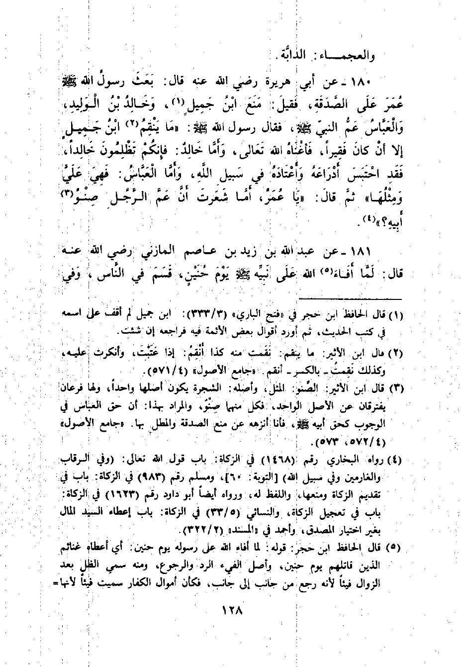 180 - عَنْ أَبِي هُرَيْرَةَ - رضي الله عنه - قَالَ: ((بَعَثَ رَسُولُ اللَّهِ - صلى الله عليه وسلم - عُمَرَ - رضي الله عنه - عَلَى الصَّدَقَةِ. فَقِيلَ: مَنَعَ ابْنُ جَمِيلٍ وَخَالِدُ بْنُ الْوَلِيدِ , وَالْعَبَّاسُ عَمُّ رَسُولِ اللَّهِ - صلى الله عليه وسلم -. فَقَالَ رَسُولُ اللَّهِ - صلى الله عليه وسلم - مَا يَنْقِمُ ابْنُ جَمِيلٍ , إلاَّ أَنْ كَانَ فَقِيراً: فَأَغْنَاهُ اللَّهُ؟ وَأَمَّا خَالِدٌ: فَإِنَّكُمْ تَظْلِمُونَ خَالِداً. وَقَدْ احْتَبَسَ أَدْرَاعَهُ وَأَعْتَادَهُ فِي سَبِيلِ اللَّهِ. وَأَمَّا الْعَبَّاسُ: فَهِيَ عَلَيَّ وَمِثْلُهَا. ثُمَّ قَالَ: يَا عُمَرُ , أَمَا شَعَرْتَ أَنَّ عَمَّ الرَّجُلِ صِنْوُ أَبِيهِ؟)) .