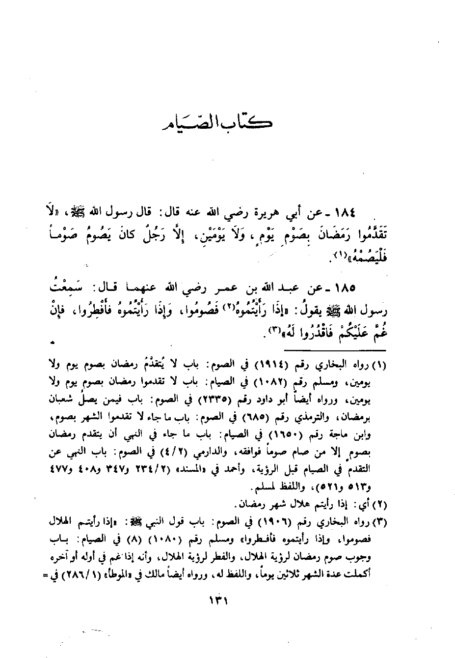185 - عَنْ عَبْدِ اللَّهِ بْنِ عُمَرَ رضي الله عنهما قَالَ: سَمِعْتُ رَسُولَ اللَّهِ - صلى الله عليه وسلم - يَقُولُ: ((إذَا رَأَيْتُمُوهُ فَصُومُوا، وَإِذَا رَأَيْتُمُوهُ فَأَفْطِرُوا، فَإِنْ غُمَّ عَلَيْكُمْ فَاقْدُرُوا لَهُ)) . -[132]-