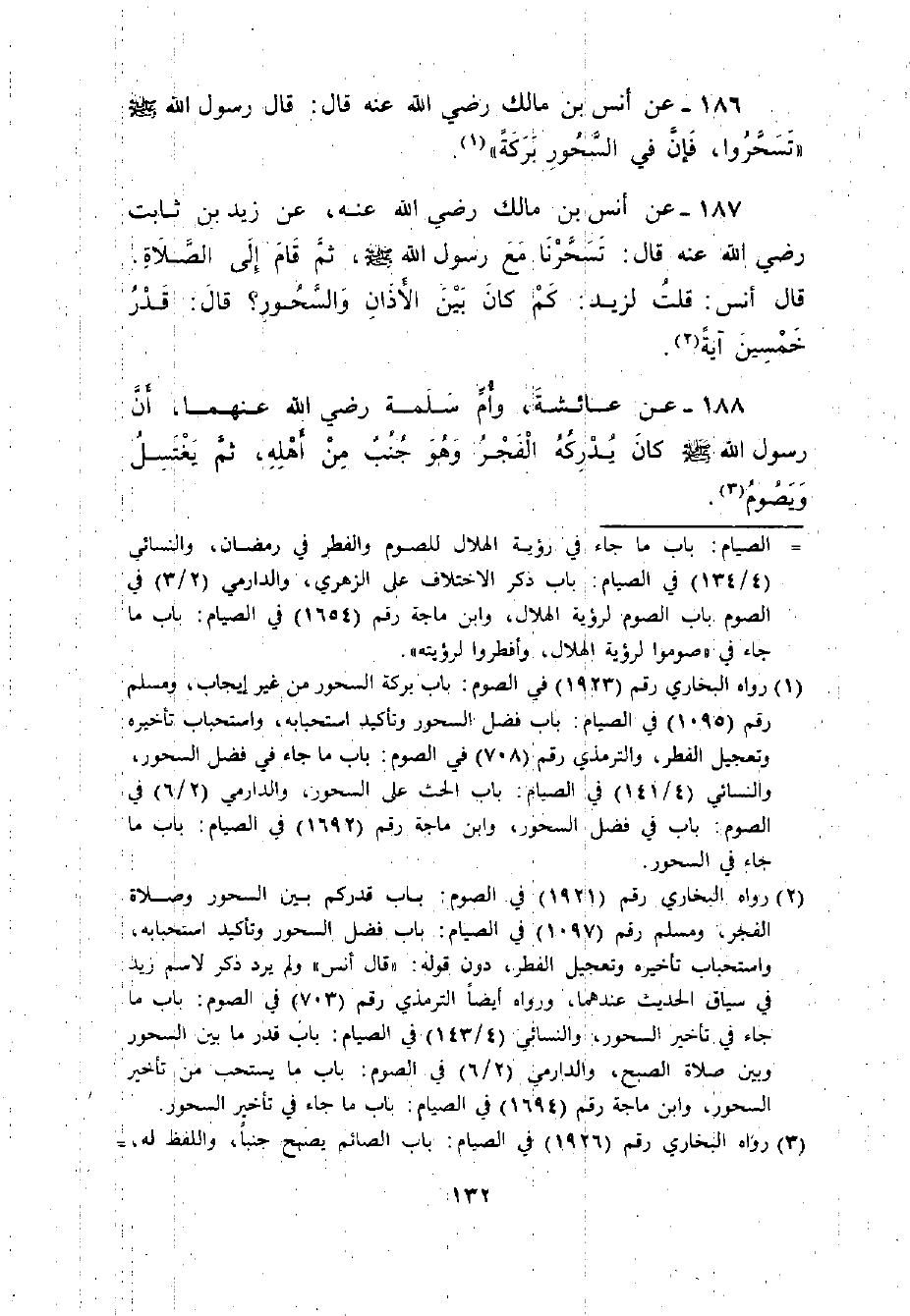 187 - عَنْ أَنَسِ بْنِ مَالِكٍ عَنْ زَيْدِ بْنِ ثَابِتٍ رضي الله عنهما قَالَ: ((تَسَحَّرْنَا مَعَ رَسُولِ اللَّهِ - صلى الله عليه وسلم -. ثُمَّ قَامَ إلَى الصَّلاةِ. قَالَ أَنَسٌ: قُلْت لِزَيْدٍ: كَمْ كَانَ بَيْنَ الأَذَانِ وَالسَّحُورِ؟ قَالَ: قَدْرُ خَمْسِينَ آيَةً)) .