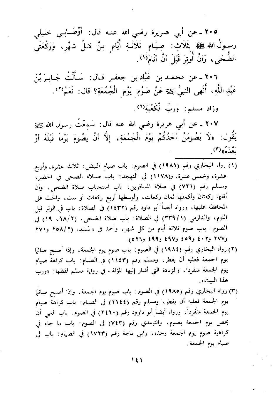 205 - عَنْ أَبِي هُرَيْرَةَ - رضي الله عنه - قَالَ: ((أَوْصَانِي خَلِيلِي - صلى الله عليه وسلم - بِثَلاثٍ صِيَامِ ثَلاثَةِ أَيَّامٍ مِنْ كُلِّ شَهْرٍ , وَرَكْعَتَيْ الضُّحَى , وَأَنْ أُوتِرَ قَبْلَ أَنْ أَنَامَ)) .