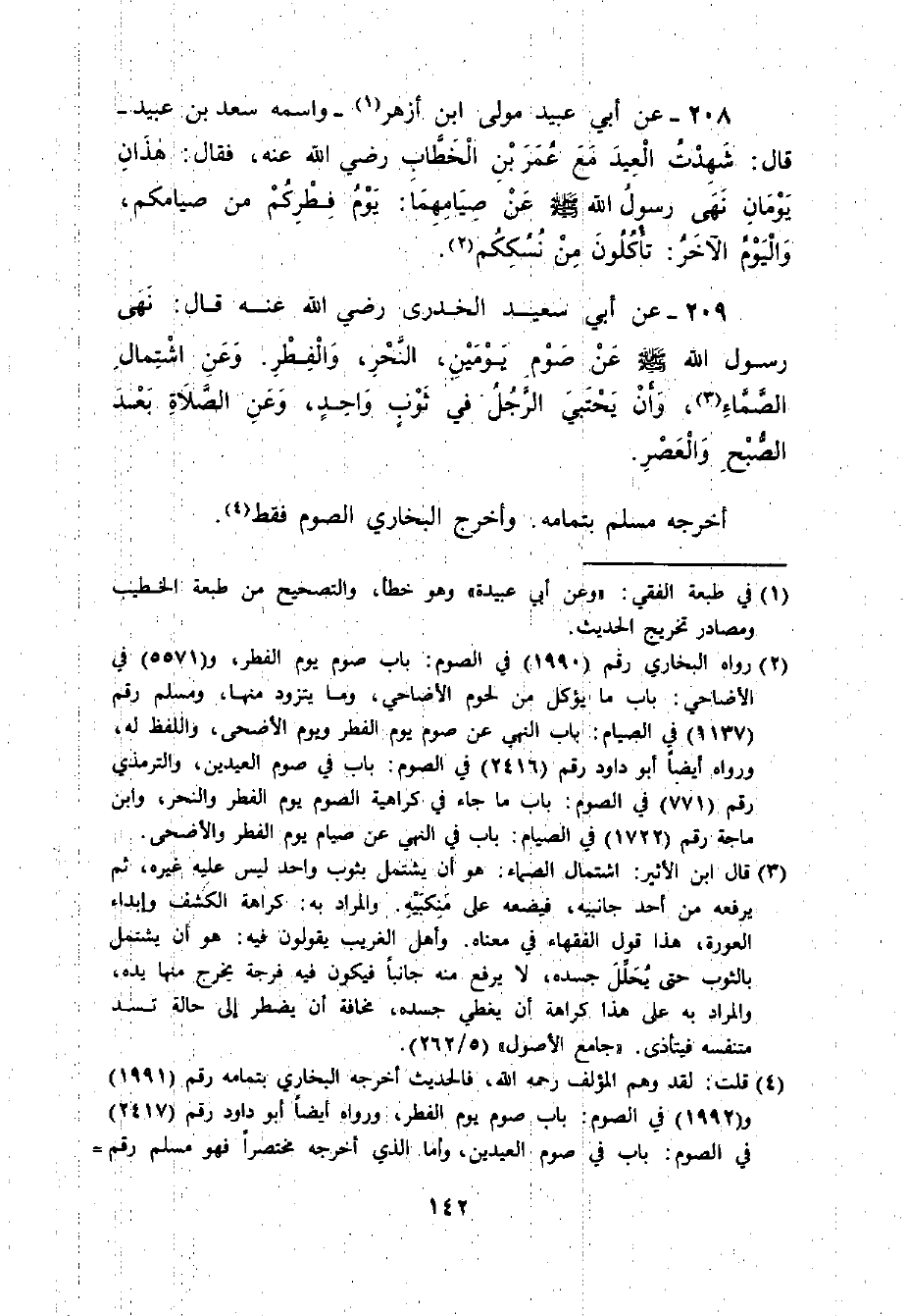 208 - عَنْ أَبِي عُبَيْدٍ مَوْلَى ابْنِ أَزْهَرَ وَاسْمُهُ سَعْدُ بْنُ عُبَيْدٍ - قَالَ: ((شَهِدْت الْعِيدَ مَعَ عُمَرَ بْنِ الْخَطَّابِ - رضي الله عنه - فَقَالَ: هَذَانِ يَوْمَانِ نَهَى رَسُولُ اللَّهِ - صلى الله عليه وسلم - عَنْ صِيَامِهِمَا: يَوْمُ فِطْرِكُمْ مِنْ صِيَامِكُمْ , وَالْيَوْمُ الآخَرُ: تَأْكُلُونَ فِيهِ مِنْ نُسُكِكُمْ)) .