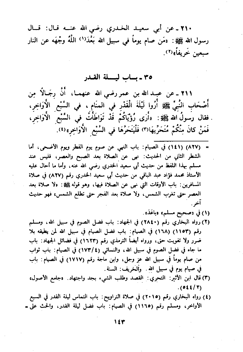 211 - عَنْ عَبْدِ اللَّهِ بْنِ عُمَرَ رضي الله عنهما: ((أَنَّ رِجَالاً مِنْ أَصْحَابِ النَّبِيِّ - صلى الله عليه وسلم - أُرُوا لَيْلَةَ الْقَدْرِ فِي الْمَنَامِ فِي السَّبْعِ الأَوَاخِرِ. فَقَالَ النَّبِيُّ - صلى الله عليه وسلم -: أَرَى رُؤْيَاكُمْ قَدْ تَوَاطَأَتْ فِي السَّبْعِ الأَوَاخِرِ. فَمَنْ كَانَ مُتَحَرِّيهَا فَلْيَتَحَرَّهَا فِي السَّبْعِ الأَوَاخِرِ)) . -[144]-