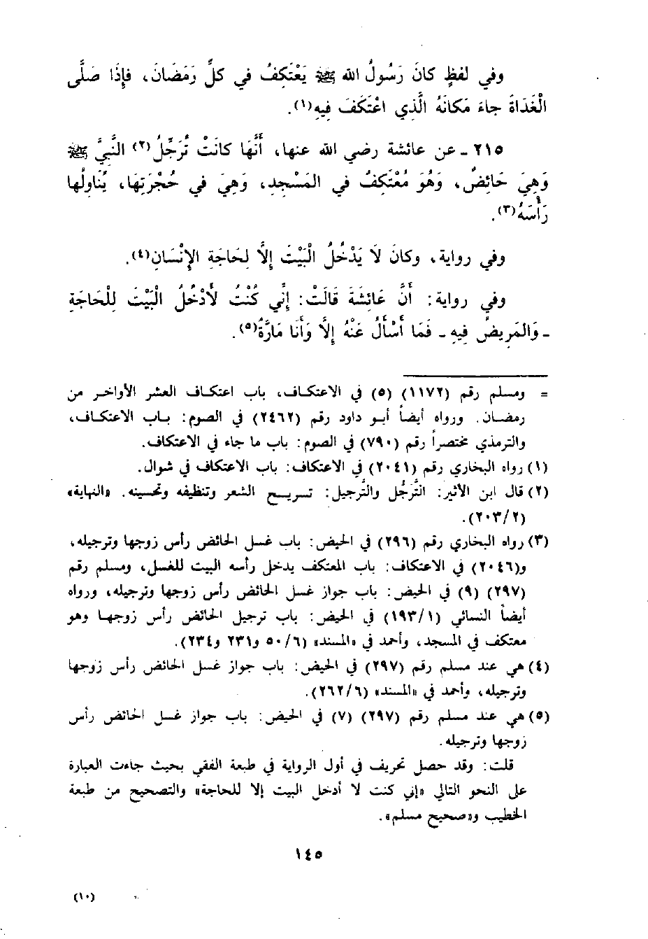 215 - عَنْ عَائِشَةَ رضي الله عنها: ((أَنَّهَا كَانَتْ تُرَجِّلُ النَّبِيَّ - صلى الله عليه وسلم - وَهِيَ حَائِضٌ , وَهُوَ مُعْتَكِفٌ فِي الْمَسْجِدِ. وَهِيَ فِي حُجْرَتِهَا: يُنَاوِلُهَا رَأْسَهُ)) .