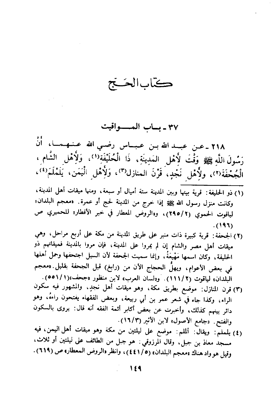 218 - عَنْ عَبْدِ اللَّهِ بْنِ عَبَّاسٍ رضي الله عنهما: ((أَنَّ رَسُولَ اللهِ - صلى الله عليه وسلم - وَقَّتَ لأَهْلِ الْمَدِينَةِ: ذَا الْحُلَيْفَةِ. وَلأَهْلِ الشَّامِ: الْجُحْفَةَ. وَلأَهْلِ نَجْدٍ: قَرْنَ الْمَنَازِلِ. وَلأَهْلِ الْيَمَنِ: يَلَمْلَمَ. -[150]- هُنَّ لَهُمْ وَلِمَنْ أَتَى عَلَيْهِنَّ مِنْ غَيْرِ أَهْلِهِنَّ , مِمَّنْ أَرَادَ الْحَجَّ أَوْ الْعُمْرَةَ. وَمَنْ كَانَ دُونَ ذَلِكَ: فَمِنْ حَيْثُ أَنْشَأَ , حَتَّى أَهْلُ مَكَّةَ مِنْ مَكَّةَ)) .