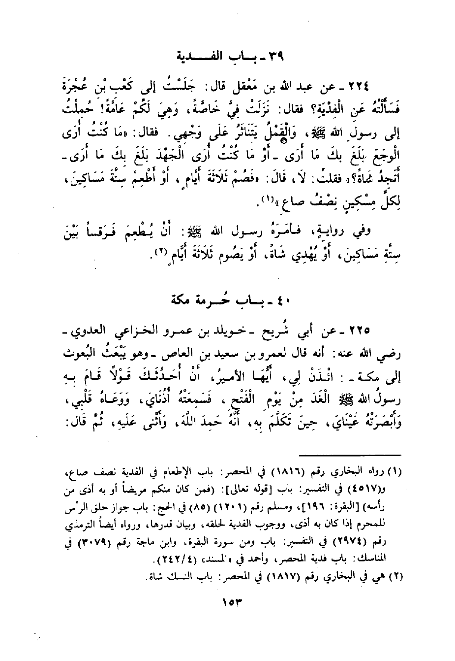224 - عَنْ عَبْدِ اللَّهِ بْنِ مَعْقِلٍ قَالَ: ((جَلَسْتُ إلَى كَعْبِ بْنِ عُجْرَةَ. فَسَأَلَتْهُ عَنِ الْفِدْيَةِ؟ فَقَالَ: نَزَلَتْ فِي خَاصَّةً. وَهِيَ لَكُمْ عَامَّةً. حُمِلْتُ إلَى رَسُولِ اللَّهِ - صلى الله عليه وسلم - وَالْقَمْلُ يَتَنَاثَرُ عَلَى وَجْهِي. فَقَالَ: مَا كُنْتُ أُرَى الْوَجَعَ بَلَغَ بِكَ مَا أَرَى - أَوْ مَا كُنْتُ أُرَى الْجَهْدَ بَلَغَ بِكَ مَا أَرَى - أَتَجِدُ شَاةً؟ فَقُلْتُ: لا. فَقَالَ: صُمْ ثَلاثَةَ أَيَّامٍ , أَوْ أَطْعِمْ سِتَّةَ مَسَاكِينَ , لِكُلِّ مِسْكِينٍ نِصْفَ صَاعٍ)) .