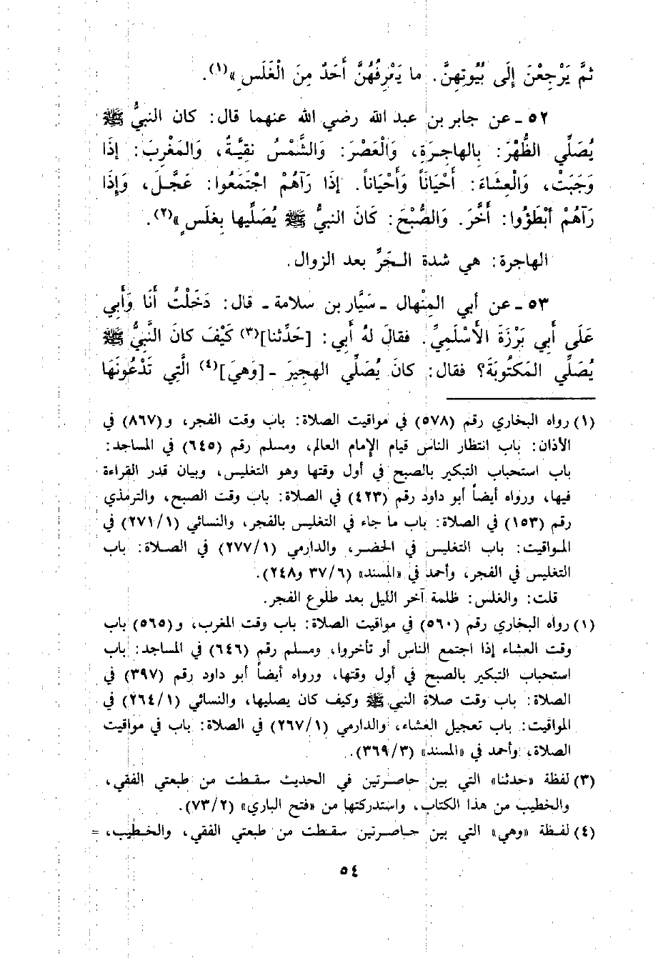 52 - عَنْ جَابِرِ بْنِ عَبْدِ اللَّهِ رضي الله عنهما قَالَ: ((كَانَ - صلى الله عليه وسلم - يُصَلِّي الظُّهْرَ بِالْهَاجِرَةِ , وَالْعَصْرَ وَالشَّمْسُ نَقِيَّةٌ وَالْمَغْرِبَ إذَا وَجَبَتْ , وَالْعِشَاءَ أَحْيَاناً وَأَحْيَاناً إذَا رَآهُمْ اجْتَمَعُوا عَجَّلَ. وَإِذَا رَآهُمْ أَبْطَئُوا أَخَّرَ , وَالصُّبْحُ كَانَ النَّبِيُّ - صلى الله عليه وسلم - يُصَلِّيهَا بِغَلَسٍ)) .