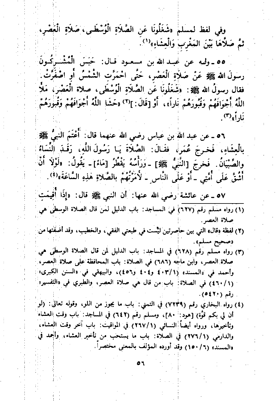 55 - وَلَهُ عَنْ عَبْدِ اللَّهِ بْنِ مَسْعُودٍ قَالَ: ((حَبَسَ الْمُشْرِكُونَ رَسُولَ اللَّهِ - صلى الله عليه وسلم - عَنِ الْعَصْرِ , حَتَّى احْمَرَّتِ الشَّمْسُ أَوْ اصْفَرَّتْ , فَقَالَ رَسُولُ اللَّهِ - صلى الله عليه وسلم -: شَغَلُونَا عَنْ الصَّلاةِ الْوُسْطَى - صَلاةِ الْعَصْرِ - مَلأَ اللَّهُ أَجْوَافَهُمْ وَقُبُورَهُمْ نَاراً , أَوْ حَشَا اللَّهُ أَجْوَافَهُمْ وَقُبُورَهُمْ نَاراً)) .