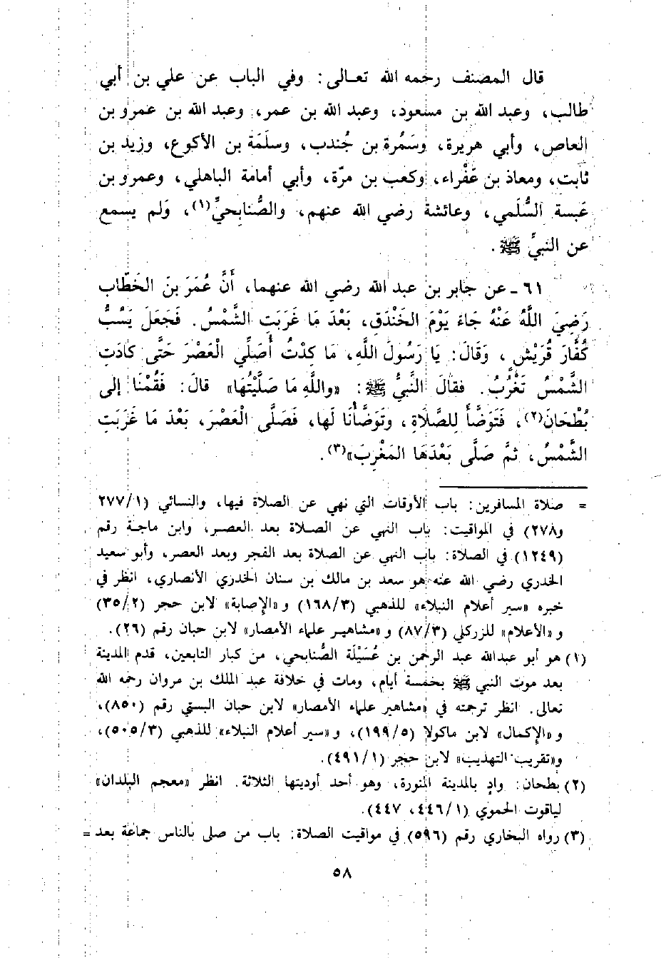61 - عَنْ جَابِرِ بْنِ عَبْدِ اللَّهِ رضي الله عنهما ((أَنَّ عُمَرَ بْنَ الْخَطَّابِ رضي الله عنه جَاءَ يَوْمَ الْخَنْدَقِ بَعْدَ مَا غَرَبَتِ الشَّمْسُ فَجَعَلَ يَسُبُّ كُفَّارَ قُرَيْشٍ , وَقَالَ: يَا رَسُولَ اللَّهِ , مَا كِدْتُ أُصَلِّي الْعَصْرَ حَتَّى كَادَتِ الشَّمْسُ تَغْرُبُ. فَقَالَ النَّبِيُّ - صلى الله عليه وسلم -: وَاَللَّهِ مَا صَلَّيْتُهَا. قَالَ: فَقُمْنَا إلَى بَطْحَانَ , فَتَوَضَّأَ لِلصَّلاةِ , وَتَوَضَّأْنَا لَهَا , فَصَلَّى الْعَصْرَ بَعْدَ مَا غَرَبَتْ الشَّمْسُ. ثُمَّ صَلَّى بَعْدَهَا الْمَغْرِبَ)) . -[59]-