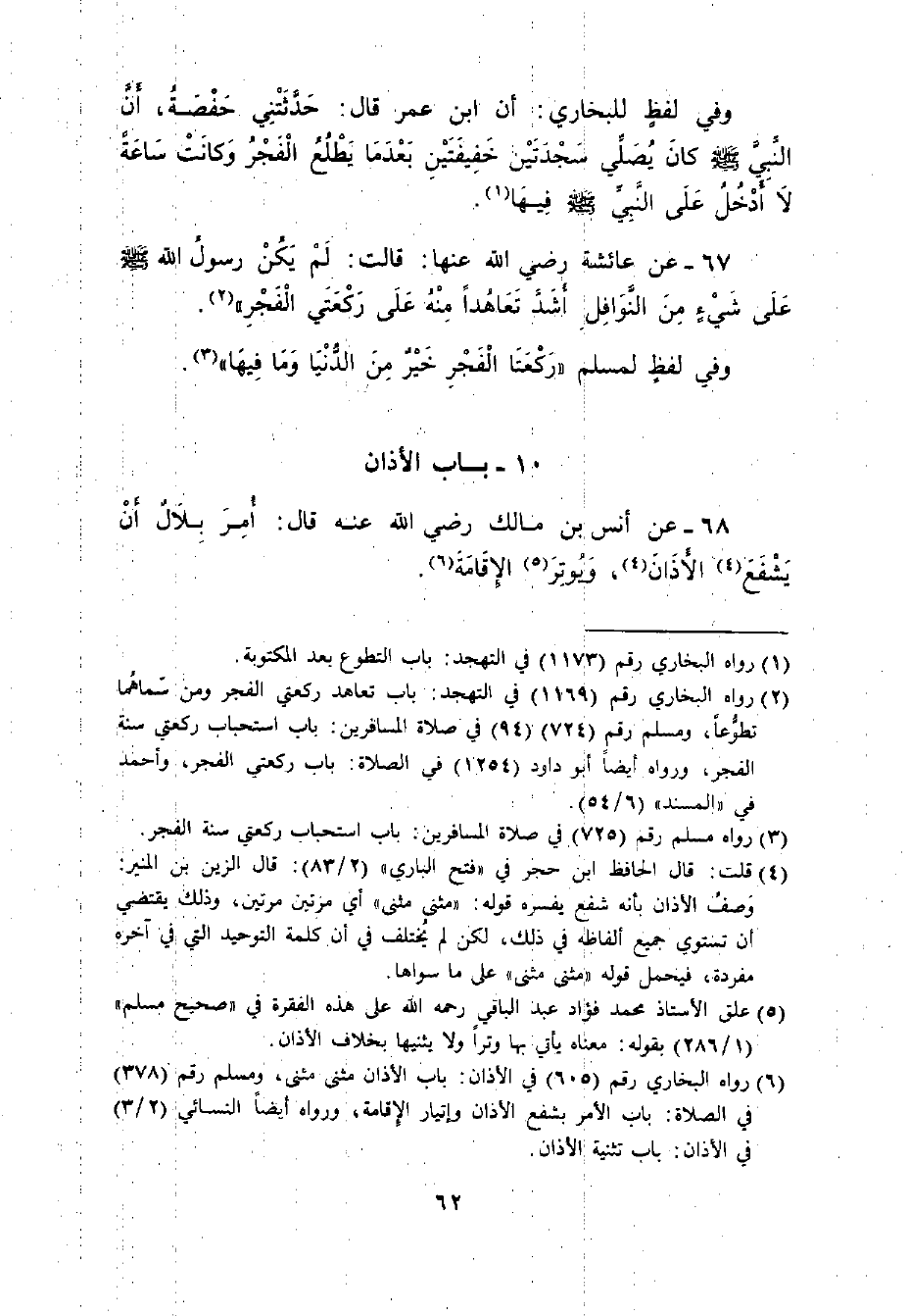 67 - عنْ عائِشَةَ رضِيَ اللهُ عنْها قالَتْ: ((لَمْ يَكُنِ النَّبِيُّ - صلى الله عليه وسلم - على شيءٍ منَ النَّوافِلِ تَعاهُدَاً منْهُ على ركْعَتَي الفَجْرِ)) .