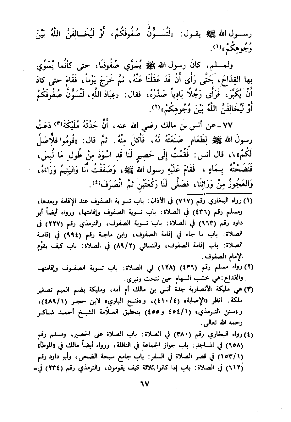 77 - عَنْ أَنَسِ بْنِ مَالِكٍ - رضي الله عنه -: ((أَنَّ جَدَّتَهُ مُلَيْكَةَ دَعَتْ رَسُولَ اللَّهِ - صلى الله عليه وسلم - لِطَعَامٍ صَنَعَتْهُ , فَأَكَلَ مِنْهُ , ثُمَّ قَالَ: قُومُوا فَلأُصَلِّيَ لَكُمْ؟ قَالَ أَنَسٌ: فَقُمْتُ إلَى حَصِيرٍ لَنَا قَدْ اسْوَدَّ مِنْ طُولِ مَا لُبِسَ , فَنَضَحْتُهُ بِمَاءٍ , فَقَامَ عَلَيْهِ رَسُولُ اللَّه - صلى الله عليه وسلم - وَصَفَفْتُ أَنَا وَالْيَتِيمُ وَرَاءَهُ , وَالْعَجُوزُ مِنْ وَرَائِنَا. فَصَلَّى لَنَا رَكْعَتَيْنِ , ثُمَّ انْصَرَفَ)) . -[68]-