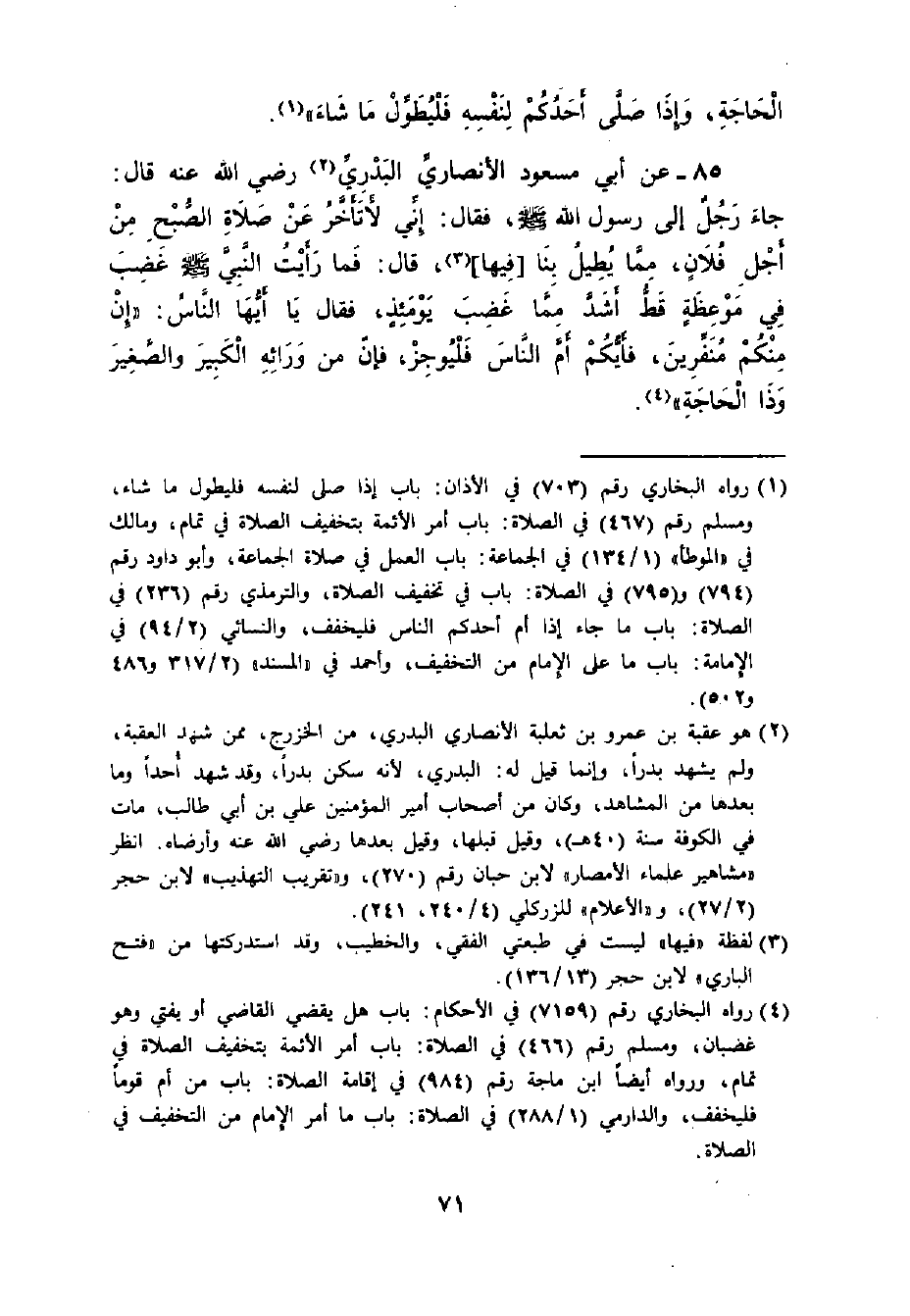 85 - وَمَا فِي مَعْنَاهُ مِنْ حَدِيثِ أَبِي مَسْعُودٍ الأَنْصَارِيِّ - رضي الله عنه - قَالَ: ((جَاءَ رَجُلٌ إلَى رَسُولِ اللَّهِ - صلى الله عليه وسلم - فَقَالَ: إنِّي لأَتَأَخَّرُ عَنْ صَلاةِ الصُّبْحِ مِنْ أَجْلِ فُلانٍ , مِمَّا يُطِيلُ بِنَا , قَالَ: فَمَا رَأَيْتُ النَّبِيَّ - صلى الله عليه وسلم - غَضِبَ فِي مَوْعِظَةٍ قَطُّ أَشَدَّ مِمَّا غَضِبَ يَوْمَئِذٍ , فَقَالَ: يَا أَيُّهَا النَّاسُ , إنَّ مِنْكُمْ مُنَفِّرِينَ , فَأَيُّكُمْ أَمَّ النَّاسَ فَلْيُوجِزْ , فَإِنَّ مِنْ وَرَائِهِ الْكَبِيرَ وَالضَّعِيفَ وَذَا الْحَاجَةِ)) .
