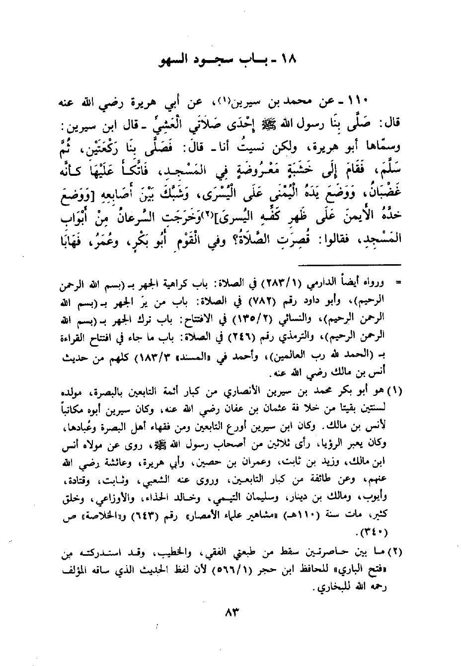 110 - عَنْ مُحَمَّدِ بْنِ سِيرِينَ، عَنْ أَبِي هُرَيْرَةَ - رضي الله عنه - قَالَ: ((صَلَّى بِنَا رَسُولُ اللهِ- صلى الله عليه وسلم - إحْدَى صَلاتَيْ الْعَشِيِّ - قَالَ ابْنُ سِيرِينَ: وَسَمَّاهَا أَبُو هُرَيْرَةَ. وَلَكِنْ نَسِيتُ أَنَا - قَالَ: فَصَلَّى بِنَا رَكْعَتَيْنِ , ثُمَّ سَلَّمَ. فَقَامَ إلَى خَشَبَةٍ مَعْرُوضَةٍ فِي الْمَسْجِدِ , فَاتَّكَأَ عَلَيْهَا كَأَنَّهُ غَضْبَانُ وَوَضَعَ يَدَهُ الْيُمْنَى عَلَى الْيُسْرَى , وَشَبَّكَ بَيْنَ أَصَابِعِهِ. وَخَرَجَتِ السَّرَعَانُ مِنْ أَبْوَابِ الْمَسْجِدِ فَقَالُوا: قَصُرَتِ الصَّلاةُ - وَفِي الْقَوْمِ أَبُو بَكْرٍ وَعُمَرُ - فَهَابَا -[84]- أَنْ يُكَلِّمَاهُ. وَفِي الْقَوْمِ رَجُلٌ فِي يَدَيْهِ طُولٌ , يُقَالُ لَهُ: ذُو الْيَدَيْنِ فَقَالَ: يَا رَسُولَ اللَّهِ , أَنَسِيتَ , أَمْ قَصُرَتِ الصَّلاةُ؟ قَالَ: لَمْ أَنْسَ وَلَمْ تُقْصَرْ. فَقَالَ: أَكَمَا يَقُولُ ذُو الْيَدَيْنِ؟ فَقَالُوا: نَعَمْ. فَتَقَدَّمَ فَصَلَّى مَا تَرَكَ. ثُمَّ سَلَّمَ , ثُمَّ كَبَّرَ وَسَجَدَ مِثْلَ سُجُودِهِ أَوْ أَطْوَلَ. ثُمَّ رَفَعَ رَأْسَهُ فَكَبَّرَ , ثُمَّ كَبَّرَ وَسَجَدَ مِثْلَ سُجُودِهِ أَوْ أَطْوَلَ. ثُمَّ رَفَعَ رَأْسَهُ وَكَبَّرَ. فَرُبَّمَا سَأَلُوهُ: ثُمَّ سَلَّمَ؟ قَالَ: فَنُبِّئْتُ أَنَّ عِمْرَانَ بْنَ حُصَيْنٍ قَالَ: ثُمَّ سَلَّمَ)) . -[85]-