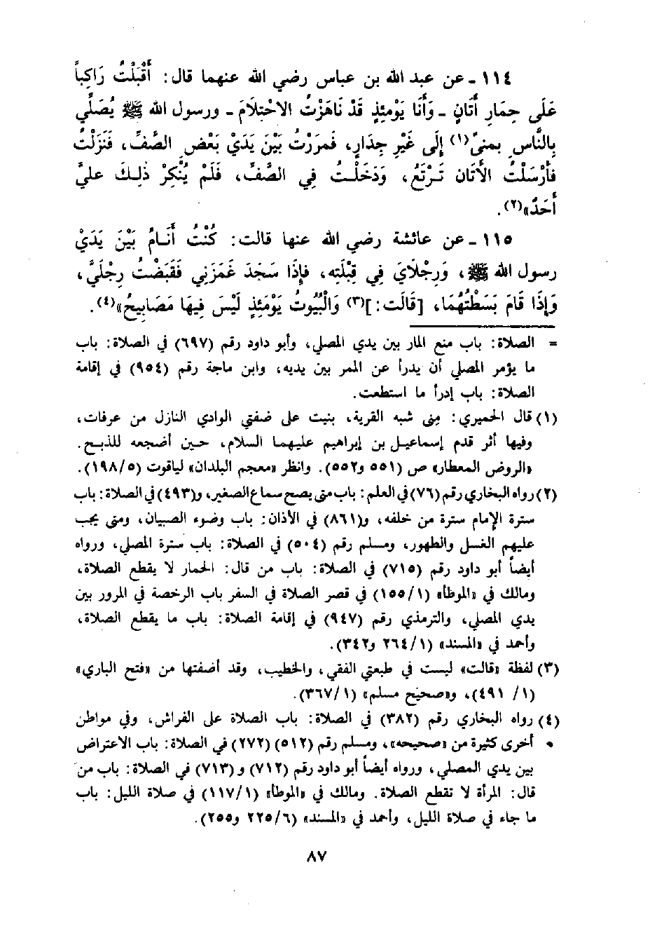 114 - عَنْ عَبْدِ اللَّهِ بْنِ عَبَّاسٍ رضي الله عنهما قَالَ: ((أَقْبَلْتُ رَاكِباً عَلَى حِمَارٍ أَتَانٍ , وَأَنَا يَوْمَئِذٍ قَدْ نَاهَزْتُ الاحْتِلامَ , وَرَسُولُ اللَّهِ - صلى الله عليه وسلم - يُصَلِّي بِالنَّاسِ بِمِنًى إلَى غَيْرِ جِدَارٍ. مَرَرْتُ بَيْنَ يَدَيْ بَعْضِ الصَّفِّ فَنَزَلْتُ , فَأَرْسَلْتُ الأَتَانَ تَرْتَعُ. وَدَخَلْتُ فِي الصَّفِّ , فَلَمْ يُنْكِرْ ذَلِكَ عَلَيَّ أَحَدٌ)) .
