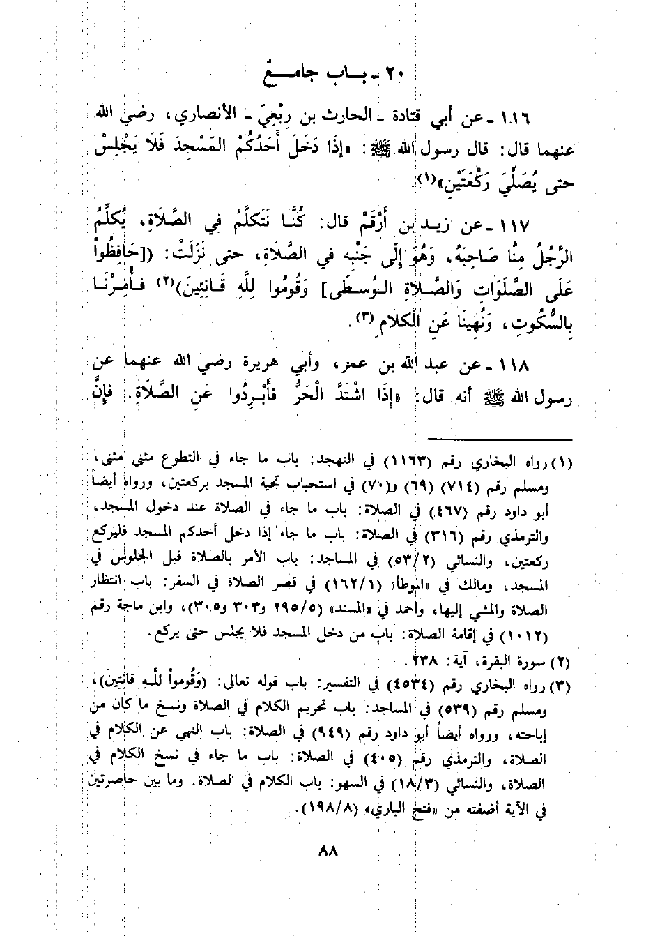 117 - عَنْ زَيْدِ بْنِ أَرْقَمَ قَالَ: ((كُنَّا نَتَكَلَّمُ فِي الصَّلاةِ، يُكَلِّمُ الرَّجُلُ صَاحِبَهُ , وَهُوَ إلَى جَنْبِهِ فِي الصَّلاةِ , حَتَّى نَزَلَتْ «وَقُومُوا لِلَّهِ قَانِتِينَ» فَأُمِرْنَا بِالسُّكُوتِ وَنُهِينَا عَنْ الْكَلامِ)) .