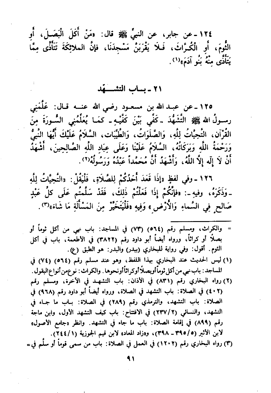 125 - عَنْ عَبْدِ اللَّهِ بنِ مَسْعُودٍ - رضي الله عنه - قَالَ: ((عَلَّمَنِي رَسُولُ اللَّهِ - صلى الله عليه وسلم - التَّشَهُّدَ - كَفِّي بَيْنَ كَفَّيْهِ - كَمَا يُعَلِّمُنِي السُّورَةَ مِنْ الْقُرْآنِ: التَّحِيَّاتُ لِلَّهِ , وَالصَّلَوَاتُ وَالطَّيِّبَاتُ , السَّلامُ عَلَيْكَ أَيُّهَا النَّبِيُّ وَرَحْمَةُ اللَّهِ وَبَرَكَاتُهُ. السَّلامُ عَلَيْنَا وَعَلَى عِبَادِ اللَّهِ الصَّالِحِينَ. أَشْهَدُ أَنْ لا إلَهَ إلاَّ اللَّهُ وَأَشْهَدُ أَنَّ مُحَمَّداً عَبْدُهُ وَرَسُولُهُ))
