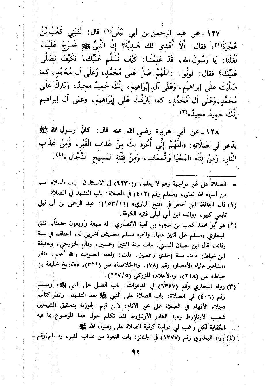 127 - عَنْ عَبْدِ الرَّحْمَنِ بْنِ أَبِي لَيْلَى قَالَ: ((لَقِيَنِي كَعْبُ بْنُ عُجْرَةَ فَقَالَ أَلا أُهْدِي لَكَ هَدِيَّةً؟ أَنَّ النَّبِيَّ صلى الله عليه وسلم خَرَجَ عَلَيْنَا , فَقُلْنَا: يَا رَسُولَ اللَّهِ , قَدْ عَلَّمَنَا اللَّهُ كَيْفَ نُسَلِّمُ عَلَيْكَ: فَكَيْفَ نُصَلِّي عَلَيْكَ؟ فَقَالَ: قُولُوا: اللَّهُمَّ صَلِّ عَلَى مُحَمَّدٍ وَعَلَى آلِ مُحَمَّدٍ , كَمَا صَلَّيْتَ عَلَى إبْرَاهِيمَ إنَّكَ حَمِيدٌ مَجِيدٌ , وَبَارِكْ عَلَى مُحَمَّدٍ وَعَلَى آلِ مُحَمَّدٍ , كَمَا بَارَكْتَ عَلَى إبْرَاهِيمَ إنَّكَ حَمِيدٌ مَجِيدٌ)) .