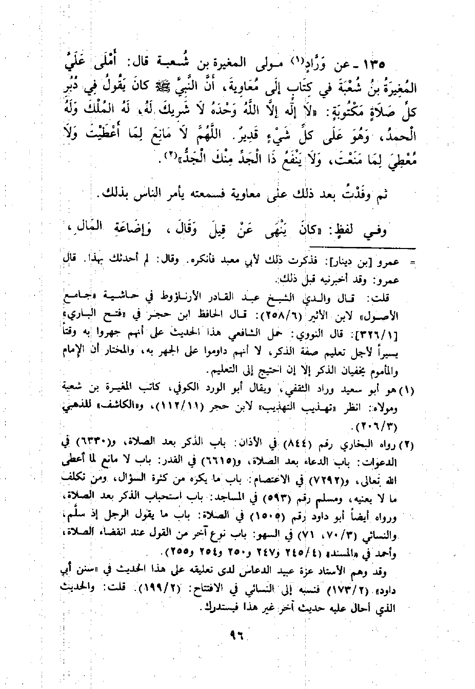 135 - عَنْ وَرَّادٍ مَوْلَى الْمُغِيرَةِ بْنِ شُعْبَةَ قَالَ: أَمْلَى عَلَيَّ الْمُغِيرَةُ بْنُ شُعْبَةَ مِنْ كِتَابٍ إلَى مُعَاوِيَةَ: ((إنَّ النَّبِيَّ - صلى الله عليه وسلم - كَانَ يَقُولُ فِي دُبُرِ كُلِّ صَلاةٍ مَكْتُوبَةٍ: " لا إلَهَ إلاَّ اللَّهُ وَحْدَهُ لا شَرِيكَ لَهُ، لَهُ الْمُلْكُ وَلَهُ الْحَمْدُ , وَهُوَ عَلَى كُلِّ شَيْءٍ قَدِيرٍ. اللَّهُمَّ لا مَانِعَ لِمَا أَعْطَيْتَ وَلا مُعْطِيَ لِمَا مَنَعْتَ , وَلا يَنْفَعُ ذَا الْجَدِّ مِنْكَ الْجَدُّ)) . ثُمَّ وَفَدْتُ بَعْدَ ذَلِكَ عَلَى مُعَاوِيَةَ فَسَمِعْتُهُ يَأْمُرُ النَّاسَ بِذَلِكَ.