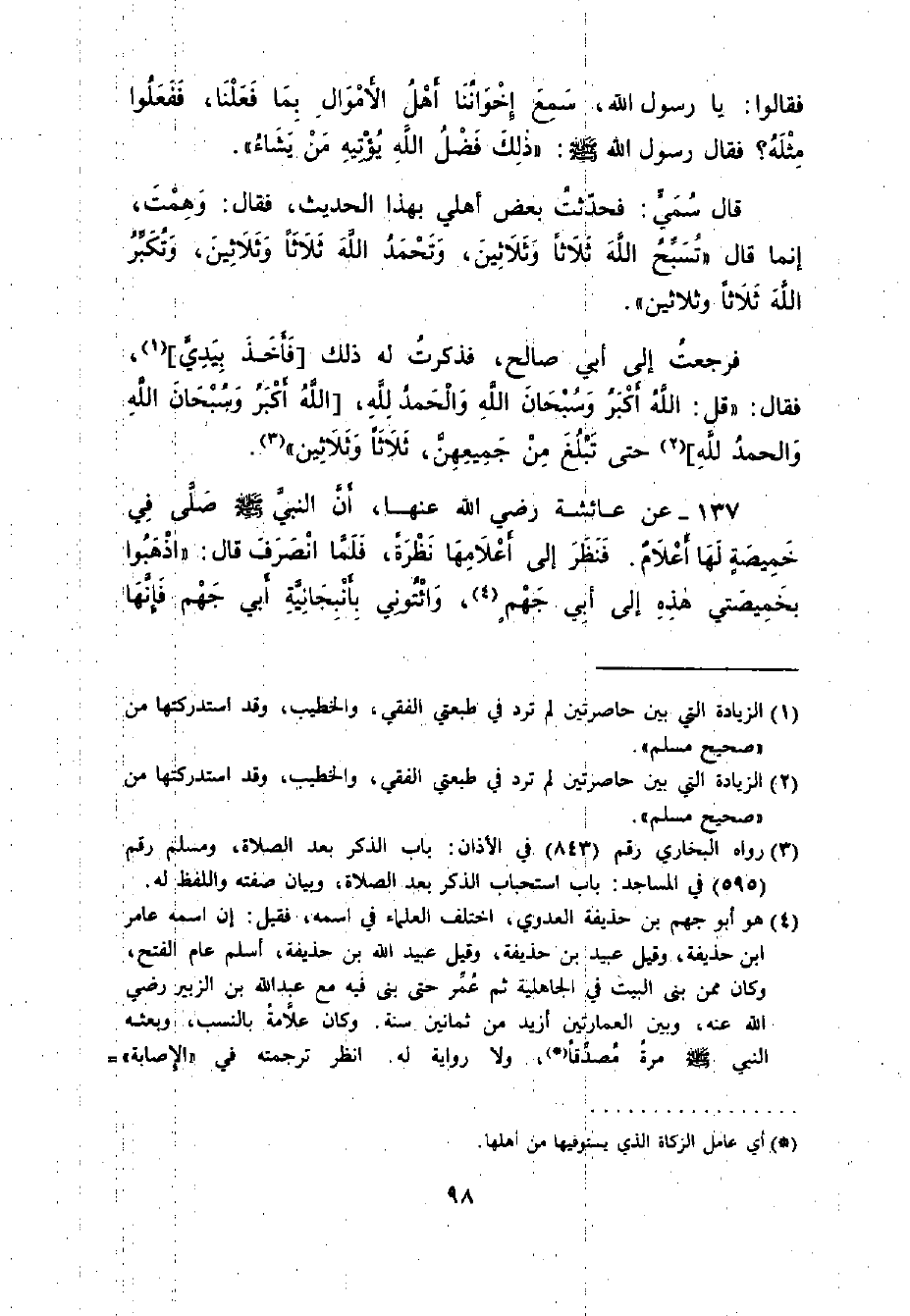 137 - عَنْ عَائِشَةَ رضي الله عنها: ((أَنَّ النَّبِيَّ - صلى الله عليه وسلم - صَلَّى فِي خَمِيصَةٍ لَهَا أَعْلامٌ. فَنَظَرَ إلَى أَعْلامِهَا نَظْرَةً. فَلَمَّا انْصَرَفَ قَالَ: اذْهَبُوا بِخَمِيصَتِي هَذِهِ إلَى أَبِي جَهْمٍ , وَأْتُونِي بِأَنْبِجَانِيَّةِ أَبِي جَهْمٍ. فَإِنَّهَا -[99]- أَلْهَتْنِي آنِفًا عَنْ صَلاتِي)) .