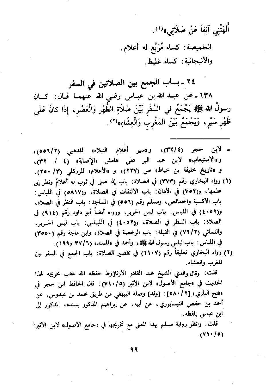 138 - عَنْ عَبْدِ اللَّهِ بْنِ عَبَّاسٍ رضي الله عنهما قَالَ: ((كَانَ رَسُولُ اللَّهِ- صلى الله عليه وسلم - يَجْمَعُ فِي السَّفَرِ بَيْنَ صَلاةِ الظُّهْرِ وَالْعَصْرِ , إذَا كَانَ عَلَى ظَهْرِ سَيْرٍ , وَيَجْمَعُ بَيْنَ الْمَغْرِبِ وَالْعِشَاءِ)) .