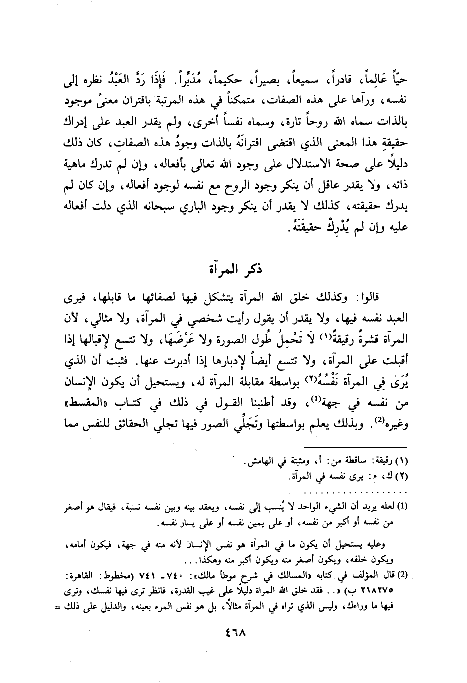 (¬2) قال المؤلف في كتابه "المسالك في شرح موطأ مالك": 740 - 741 (مخطوط: القاهرة: 218275 ب) " .. فقد خلق الله المرآة دليلاً على غيب القدرة، فانظر ترى فيها نفسك، وترى فيها ما وراءك، ولي الذي تراه في المرآة مثالاً، بل هو نفس المرء بعينه، والدليل على ذلك =