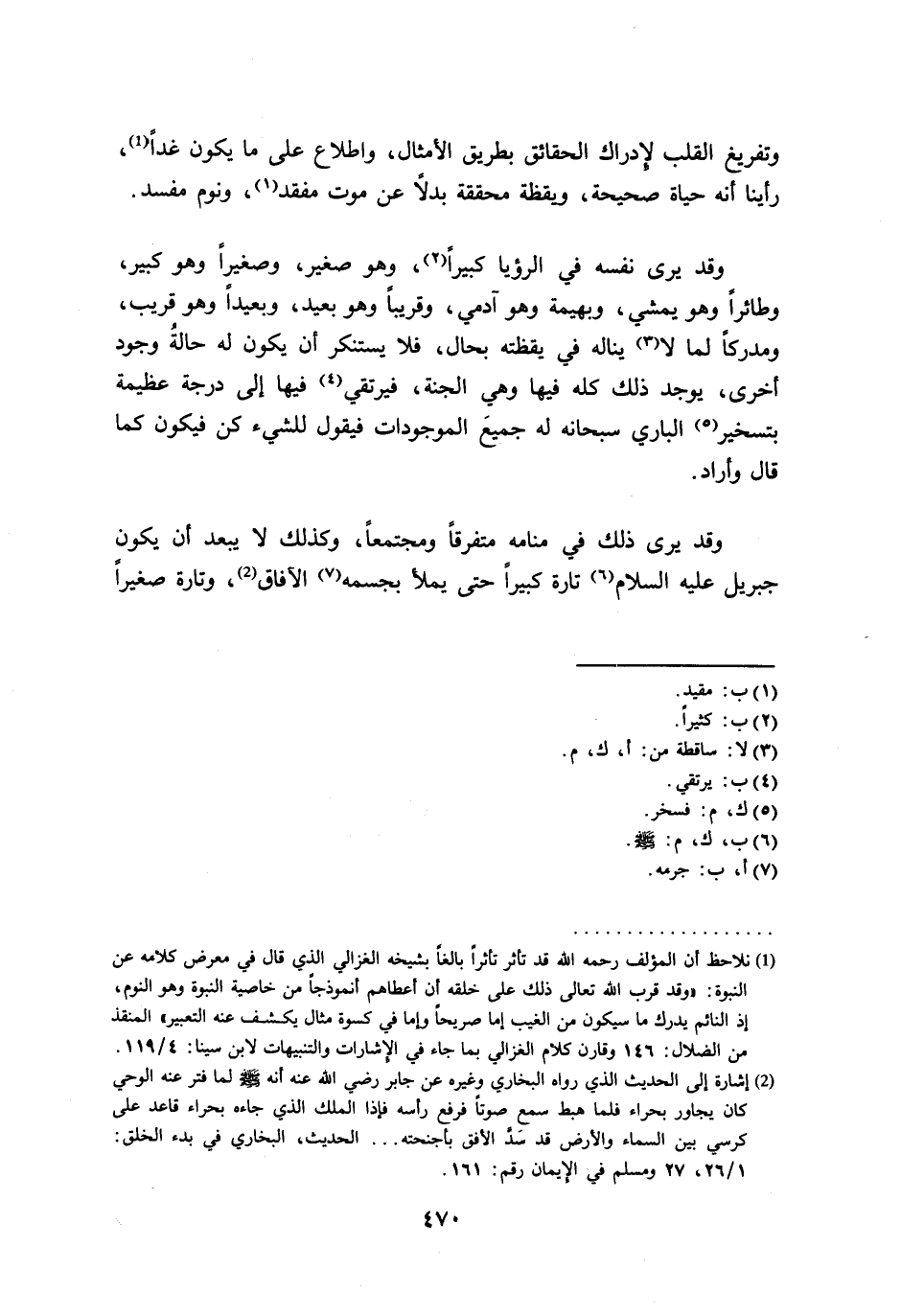 (¬1) نلاحظ أن المؤلف رحمه الله قد تأثر تأثراً بالغاً بشيخه الغزالي الذي قال في معرض كلامه عن النبوة: "وقد قرب الله تعالى ذلك على خلقه أن أعطاهم أنموذجاً من خاصية النبوة وهو النوم، إذ النائم يدرك ما سيكون من الغيب إما صريحاً وإما في كسوة مثال يكشف عنه التعبير" المنقذ من الضلال: 146 وقارن كلام الغزالي بما جاء في الإشارات والتنبيهات لابن سينا: 4/ 119.