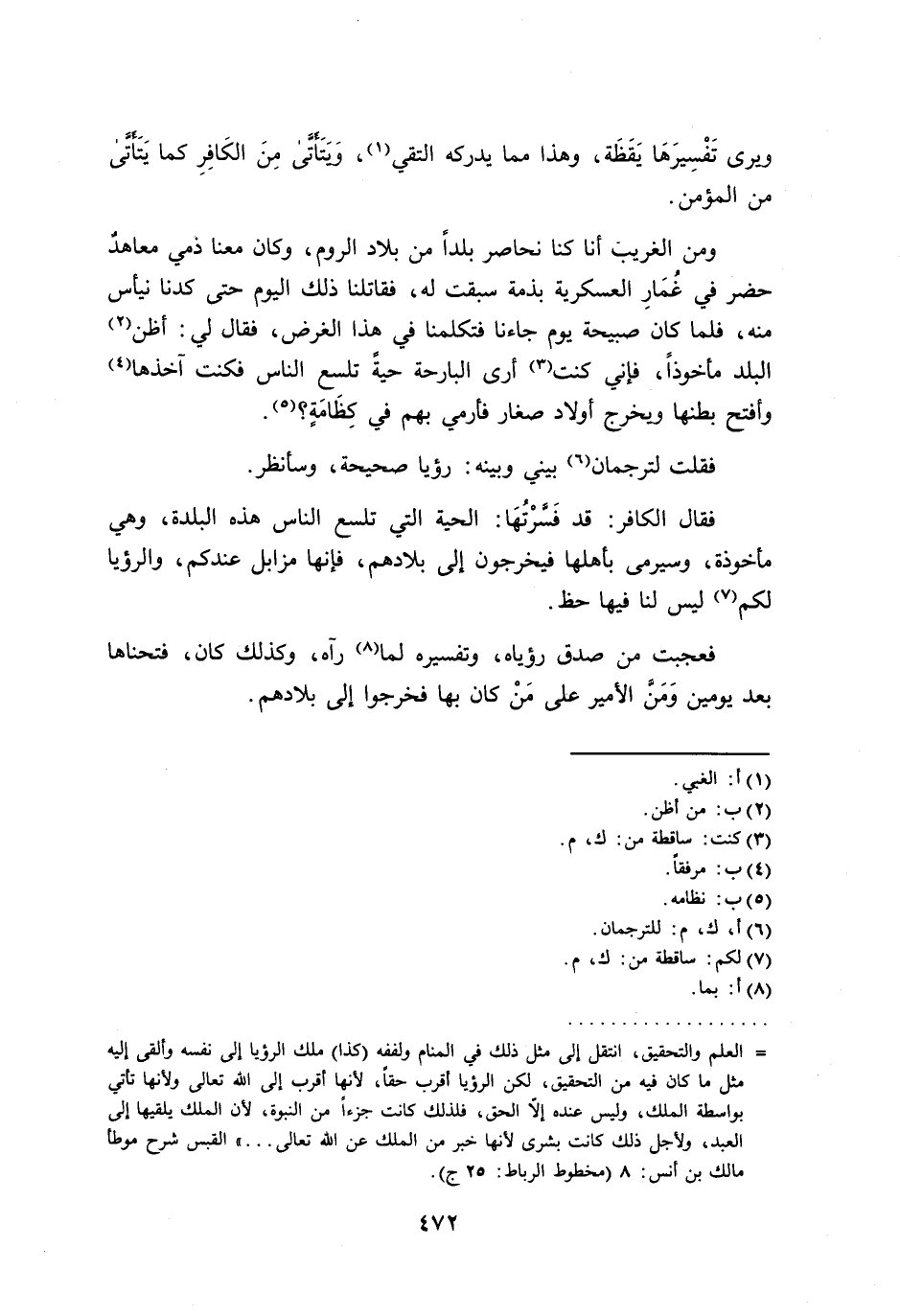 ومن الغريب أنا كنا نحاصر بلداً من بلاد الروم، وكان معنا ذمي معاهدٌ حضر في غُمَارِ العسكرية بذمة سبقت له، فقاتلنا ذلك اليوم حتى كدنا نيأس منه، فلما كان صبيحة يوم جاءنا فتكلمنا في هذا الغرض، فقال لي: أظن البلد مأخوذاً، فإني كنت أرى البارحة حيةً تلسع الناس فكنت آخذها وأفتح بطنها ويخرج أولاد صغار فأرمي بهم في كِظَامَةٍ؟.