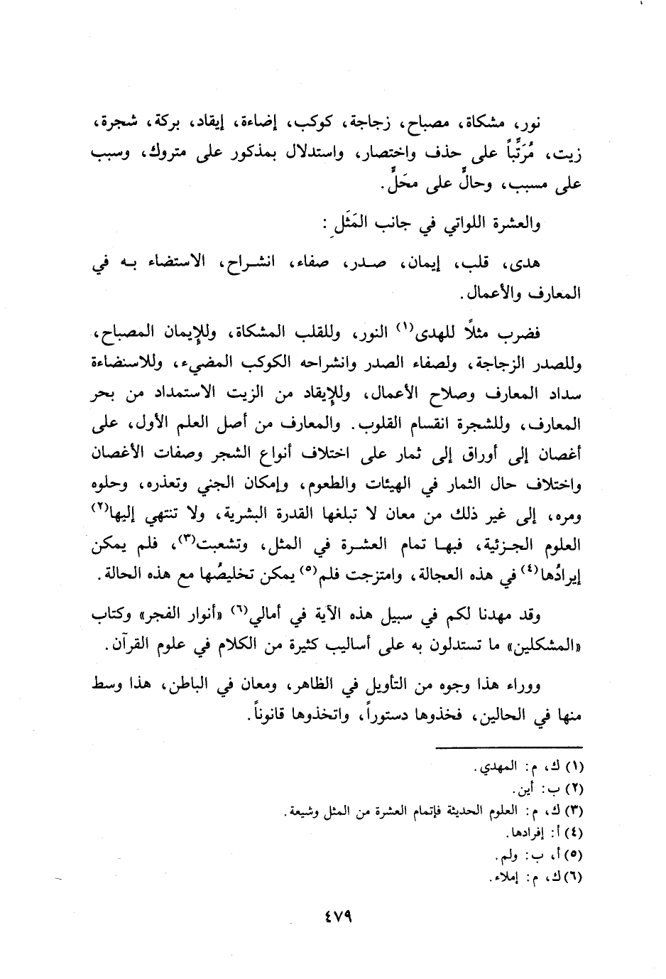 فضرب مثلًا للهدى (1) النور، وللقلب المشكاة، وللإيمان المصباح، وللصدر الزجاجة، ولصفاء الصدر وانشراحه الكوكب المضيء، وللاستضاءة سداد المعارف وصلاح الأعمال، وللإيقاد من الزيت الاستمداد من بحر المعارف، وللشجرة انقسام القلوب. والمعارف من أصل العلم الأول، على أغصان إلى أوراق إلى ثمار على اختلاف أنواع الشجر وصفات الأغصان واختلاف حال الثمار في الهيئات والطعوم، وإمكان الجني وتعذره، وحلوه ومره، إلى غير ذلك من معان لا تبلغها القدرة البشرية، ولا تنتهي إليها العلوم الجزئية، فبها تمام العشرة في المثل، وتشعبت، فلم يمكن إيرادُها في هذه العجالة، وامتزجت فلم يمكن تخليصُها مع هذه الحالة.
