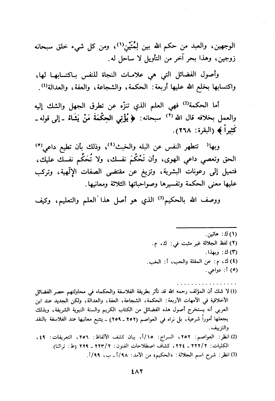 (¬1) لا شك أن المؤلف رحمه الله قد تأثر بطريقة الفلاسفة والحكماء في محاولتهم حصر الفضائل الأخلاقية في الأمهات الأربعة: الحكمة، الشجاعة، العفة، والعدالة، ولكن الجديد عند ابن العربي أنه يستخرج أصول هذه الفضائل من الكتاب الكريم والسنة النبوية الشريفة، وبذلك يجعلها أموراً شرعية، بل نراه في العواصم (252 - 259) - يتتبع معانيها عند الفلاسفة بالنقد والتزييف.