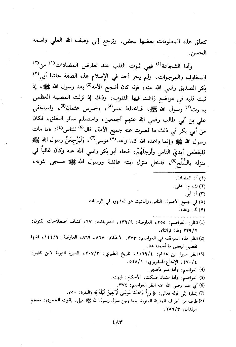 وأما الشجاعة (¬1) فهي ثبوت القلب عند تعارض المضادات من المخاوف والمرجوات، ولم يحز أحد في الإِسلام هذه الصفة حاشا أبي بكر الصديق رضي الله عنه، فإنه كان أشجع الأمة (¬2) بعد رسول الله - صلى الله عليه وسلم -، إذ ثبت قلبه في مواضع زاغت فيها القلوب، وذلك إذ نزلت المصيبة العظمى بموت (¬3) رسول الله - صلى الله عليه وسلم -، فاختلط عمر (¬4)، وخرس عثمان (¬5)، واستخفى علي بن أبي طالب رضي الله عنهم أجمعين، واستسلم سائر الخلق، فكان من أبي بكر في ذلك ما قصرت عنه جميع الأمة، قال (¬6) للناس: "ما مات رسول الله - صلى الله عليه وسلم - وإنما واعده الله كما واعد موسى (¬7)، وَلَيَرْجِعَنَّ رسول الله - صلى الله عليه وسلم - فليقطعن أيديَ الناس وأرجلَهُمْ، فجاء أبو بكر رضي الله عنه وكان غائباً في منزله بالسُّنْح (¬8)، فدخل منزل ابنته عائشة ورسول الله - صلى الله عليه وسلم - مسجى بثوبه،