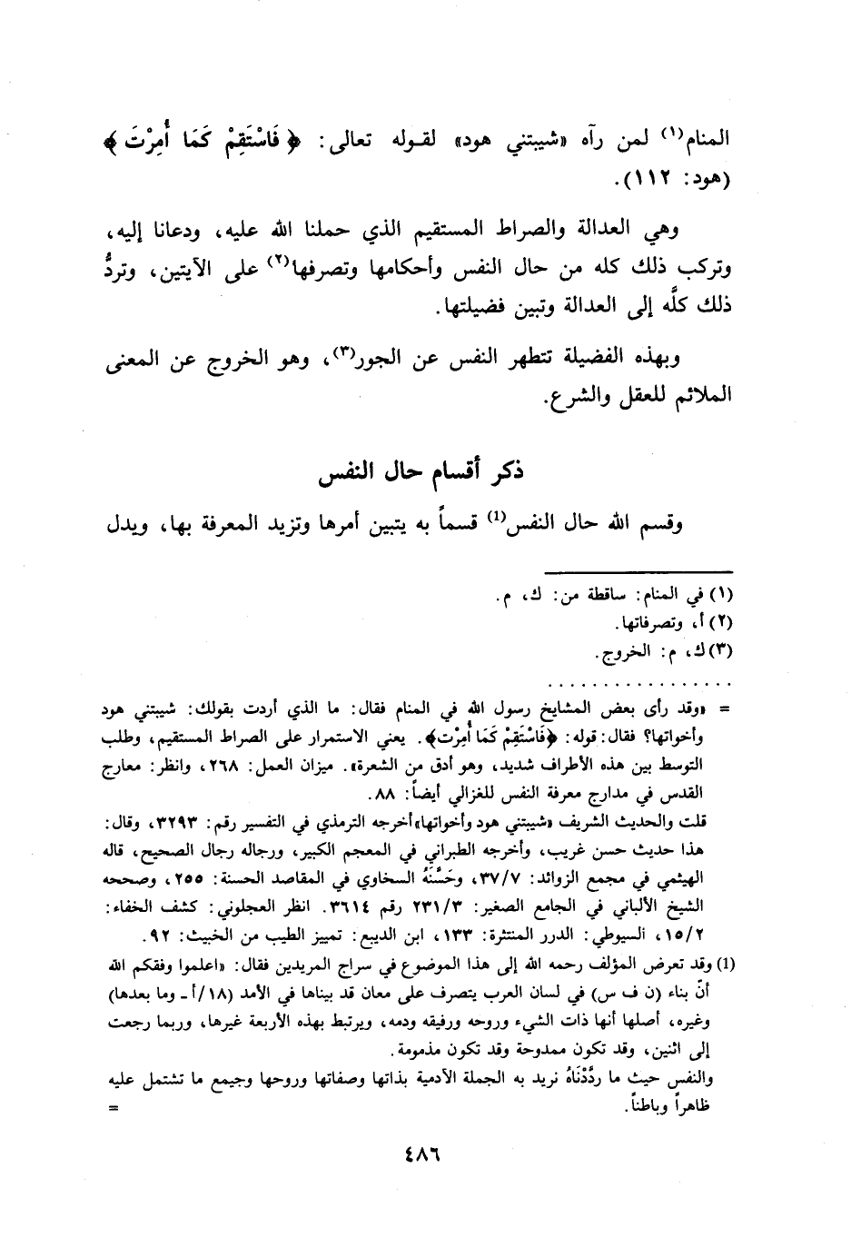 = "وقد رأى بعض المشايخ رسول الله في المنام فقال: ما الذي أردت بقولك: شيبتني هود وأخواتها؟ فقال: قوله: {فَاسْتَقِمْ كَمَا أُمِرْتَ}. يعني الاستمرار على الصراط المستقيم، وطلب التوسط بين هذه الأطراف شديد، وهو أدق من الشعرة". ميزان العمل: 268، وانظر: معارج القدس في مدارج معرفة النفس للغزالي أيضاً: 88.