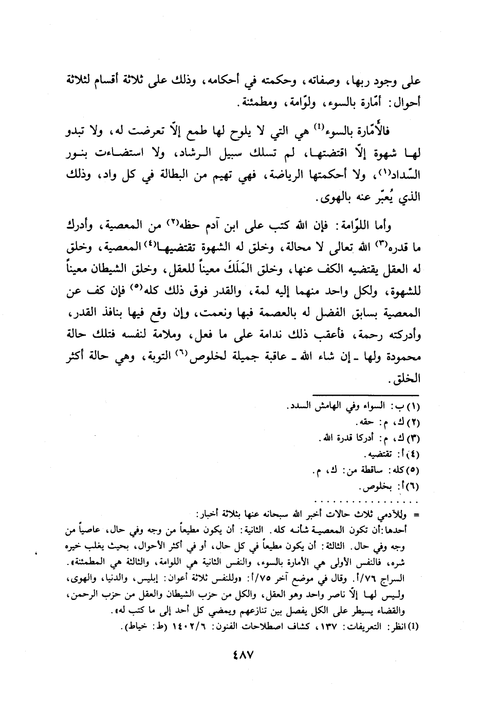 أحدها: أن تكون المعصية شأنه كله. الثانية: أن يكون مطيعاً من وجه وفي حال، عاصياً من وجه وفي حال. الثالثة: أن يكون مطيعاً في كل حال، أو في أكثر الأحوال، بحيث يغلب خيره شره، فالنفس الأولى هي الأمارة بالسوء، والنفس الثانية هي اللوامة، والثالثة هي المطمئنة".