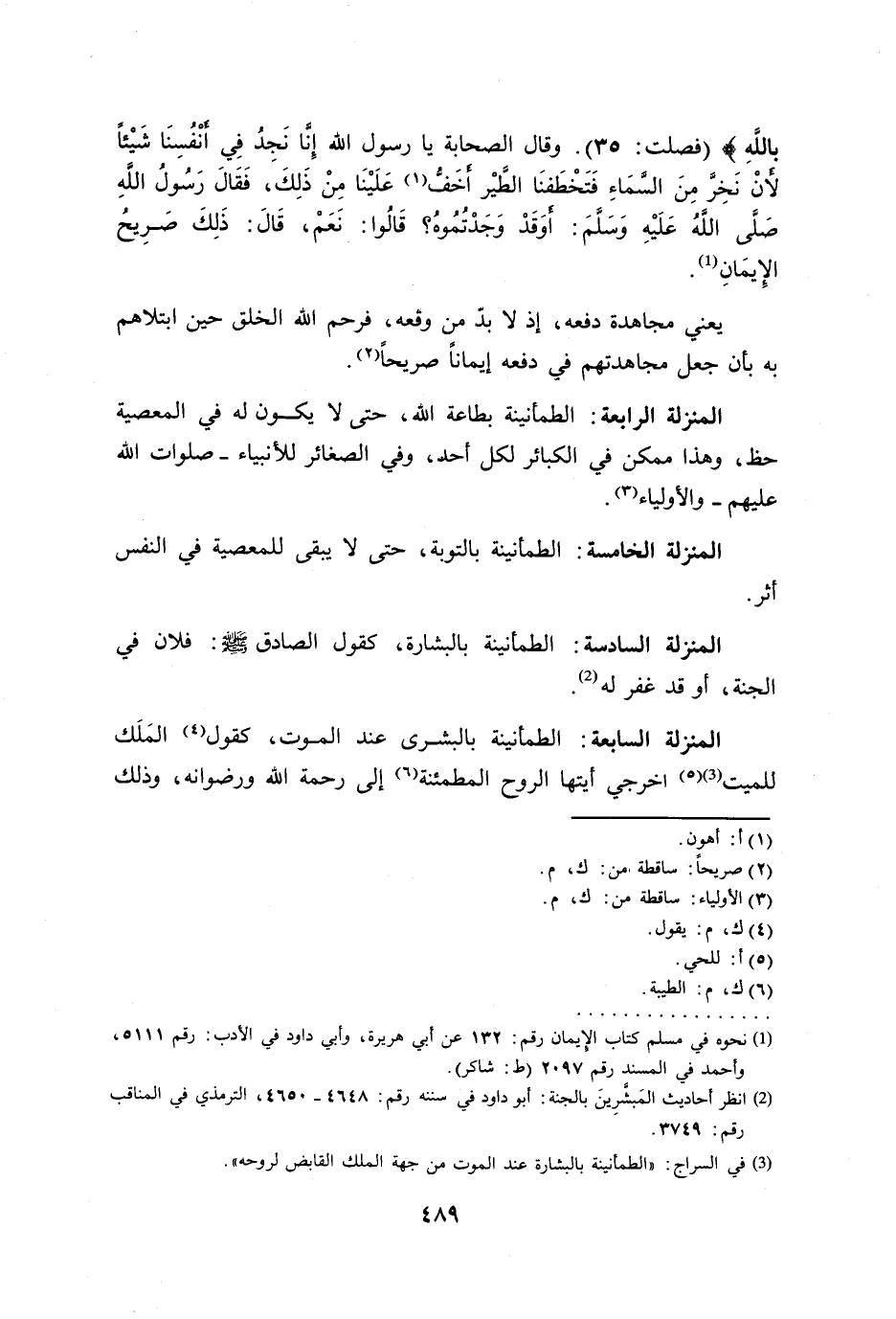 (¬3) في السراج: "الطمأنينة بالبشارة عند الموت من جهة الملك القابض لروحه".