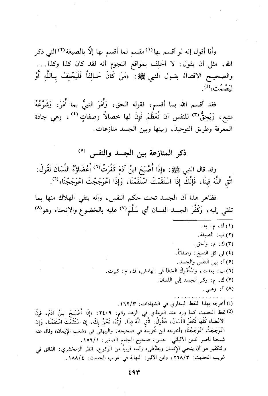 فقد أقسم الله بما أقسم، فقوله الحق، وَأمرَ النبي بما أمرَ، وَشَرْعُهُ متبع، وَيَحِقُّ للنفس أن تُعَظَّمَ فَإِنَ لها خصالًا وصفاتٍ، وهي جادة المعرفة وطريق التوحيد، وبينها وبين الجسد منازعات.