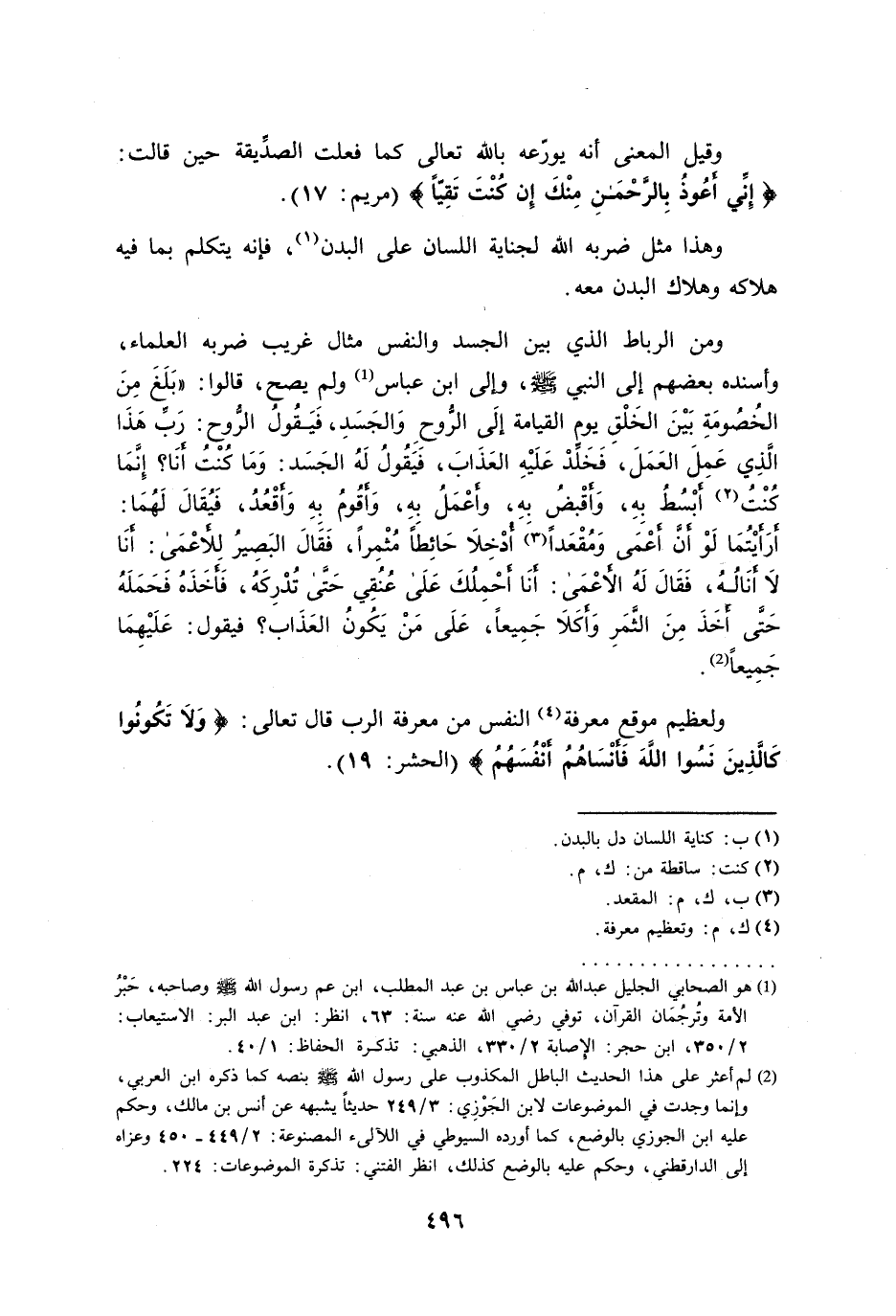 ومن الرباط الذي بين الجسد والنفس مثال غريب ضربه العلماء، وأسنده بعضهم إلى النبي - صلى الله عليه وسلم -، وإلى ابن عباس (¬1) ولم يصح، قالوا: "بَلَغَ مِنَ الخُصُومَةِ بَيْنَ الخَلْقِ يوم القيامة إلَى الروح وَالجَسَدِ، فيَقُولُ الرَّوح: رَبَ هَذَا الَّذِي عَمِلَ العَمَلَ، فَخَلدْ عَلَيْهِ العَذَابَ، فيَقُولُ لَهُ الجَسَد: وَمَا كُنْتُ أنَا؟ إِنَّمَا كُنْتُ أبْسُطُ بِهِ، وَأقْبضُ بهِ، وأعْمَلُ بهِ، وَأقُومُ بهِ وَأقْعُدُ، فَيُقَالَ لَهُمَا: أرَأيْتُمَا لَوْ أنَّ أعْمَى وَمُقْعَداً أُدْخِلَا حَائِطَاً مُثْمِراً، فَقًالَ البَصِيرُ لِلأعْمَى: أنَا لَا أنَالُهُ، فَقَالَ لَهُ الأعْمَى: أنَا أحْمِلُكَ عَلَى عُنُقِي حَتَّى تُدْرِكَهُ، فَأخَذَهُ فَحَمَلَهُ حَتَّى أخذ مِنَ الثمَرِ وَأكَلَا جَمِيعاً، عَلَى مَنْ يَكُونُ العَذَاب؟ فيقول: عَلَيْهمَا جَمِيعاً (¬2).