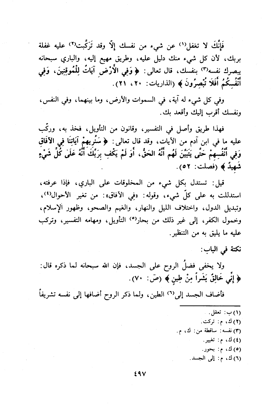 فَإنَّكَ لا تغفل عن شيء من نفسك إلاَّ وقد تَرَكَّبت عليه غفلة بربك، لأن كل شيء منك دليل عليه، وطريق مهيع إليه، والباري سبحانه يبصرك نفسه بنفسك، قال تعالى: {وَفِي الْأَرْضِ آيَاتٌ لِلْمُوقِنِينَ (20) وَفِي أَنْفُسِكُمْ أَفَلَا تُبْصِرُونَ} [الذاريات: 20 - 21].
