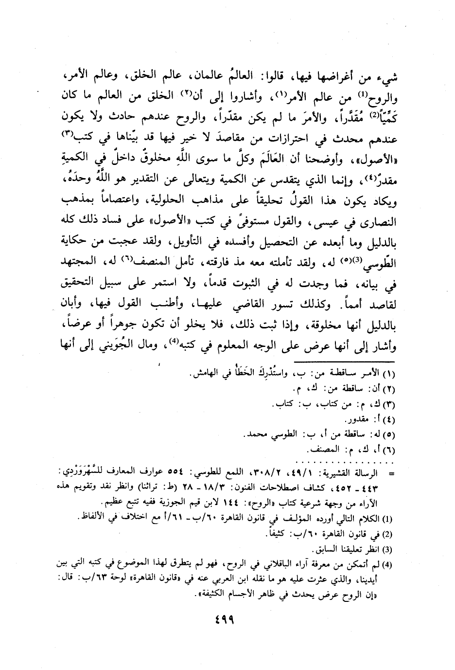 (¬4) لم أتمكن من معرفة آراء الباقلاني في الروح، فهو لم يتطرق لهذا الموضوع في كتبه التي بين أيدينا، والذي عثرت عليه هو ما نقله ابن العربي عنه في "قانون القاهرة" لوحة 63/ ب: قال: "إن الروح عرض يحدث في ظاهر الأجسام الكثيفة".