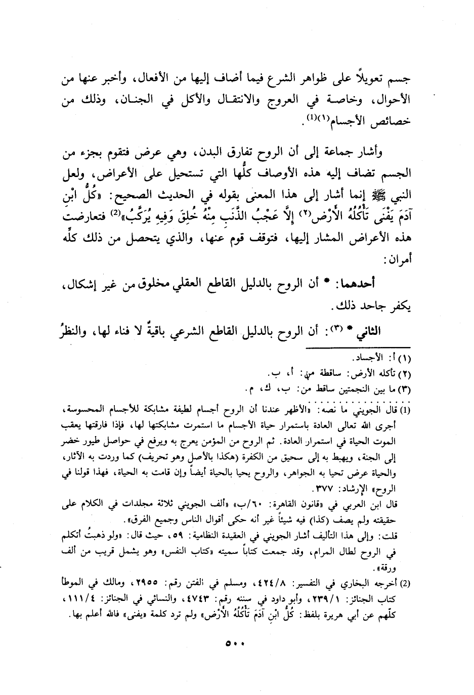(¬1) قال الجويني ما نصه: "الأظهر عندنا أن الروح أجسام لطيفة مشابكة للأجسام المحسوسة، أجرى الله تعالى العادة باستمرار حياة الأجسام ما استمرت مشابكتها لها، فإذا فارقتها يعقب الموت الحياة في استمرار العادة. ثم الروح من المؤمن يعرج به ويرفع في حواصل طيور خضر إلى الجنة، ويهبط به إلى سحيق من الكفرة (هكذا بالأصل وهو تحريف) كما وردت به الآثار، والحياة عرض تحيا به الجواهر، والروح يحيى بالحياة أيضاً وإن قامت به الحياة، فهذا قولنا في الروح" الإرشاد: 377.